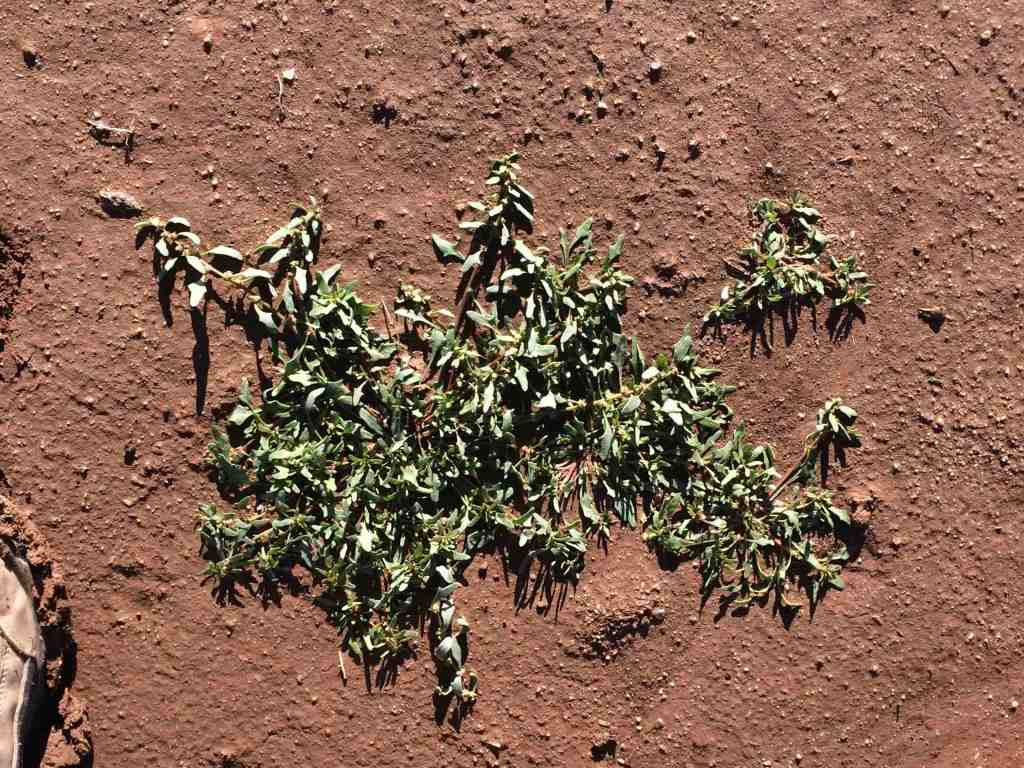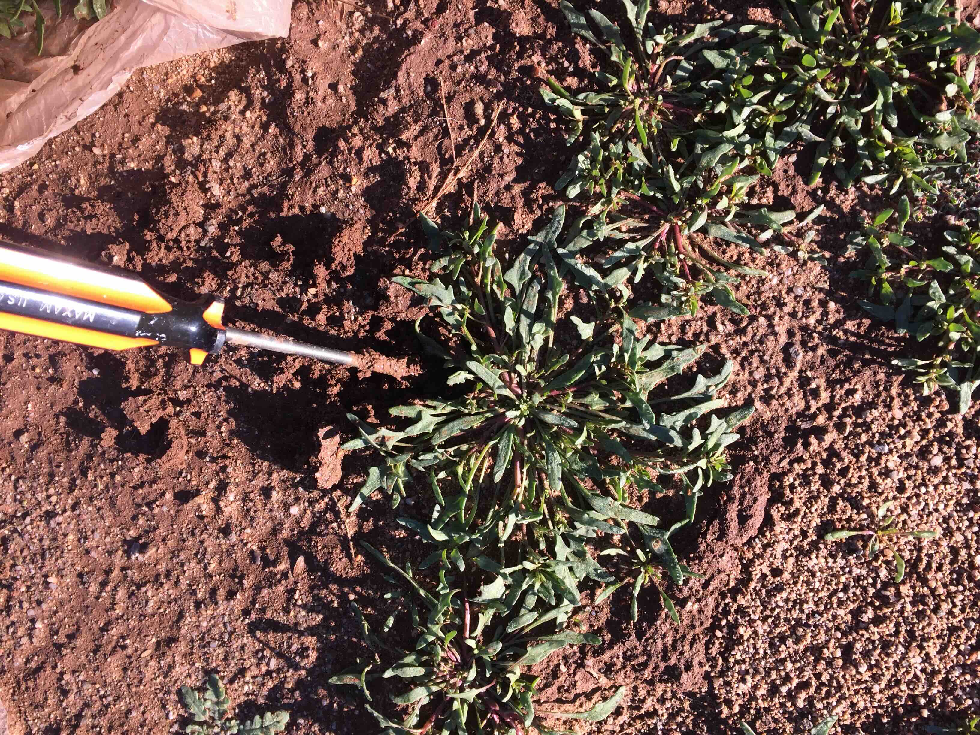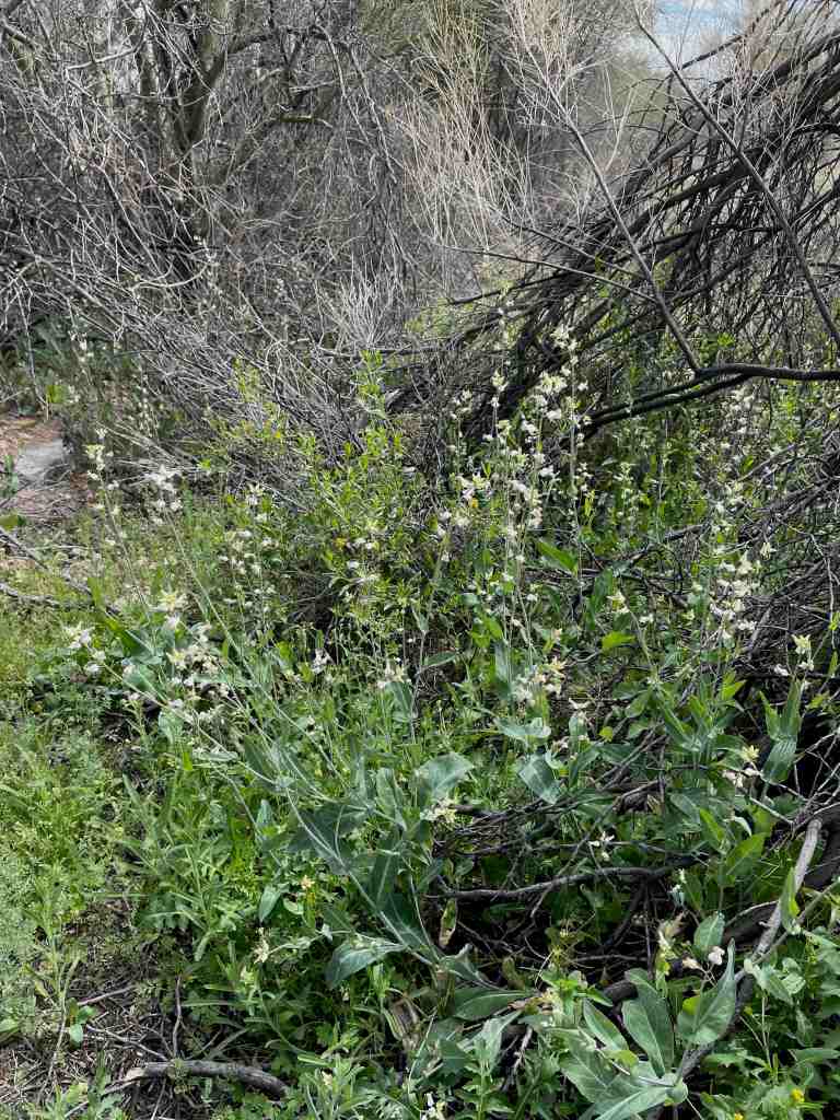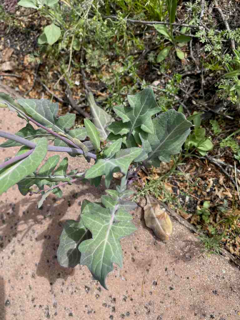Here’s another “weed”–my very favorite, but very rare–which my O’odham mentor showed me years ago–opon i:wagĭ. Known in Spanish as patota, and in English by the truly misleading term “poverty weed,” it only comes up in certain years with winter rains at just the right times and in right amounts. She led me to harvest in corrals and roadsides on the poorest soils, and there appeared these patches of flat-lying rosettes of small thick leaves, so unassuming. Not very noticeable but worth noticing!