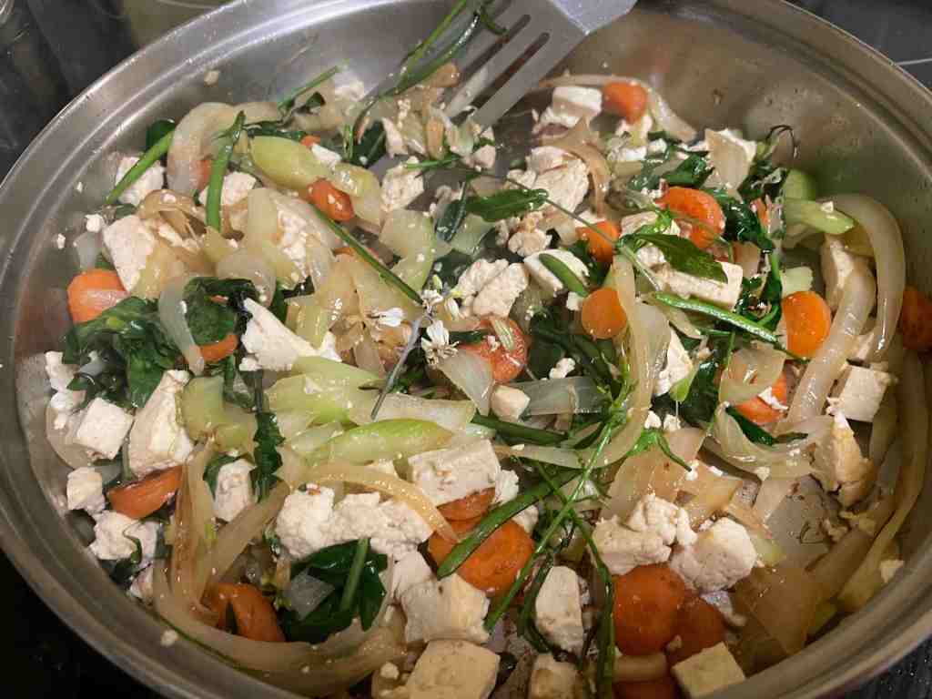 Silverbells is a Brassica, that is, in the cole-family of highly nutritious vegetables. Besides in a fresh mixed salad, my favorite way to enjoy their nutrition (high Ca, vit.A and C, folates) is in a veggie stir-fry. I have added the greens last in this tofu stir-fry. Can you spot the silverbell flowers I topped this dish with?