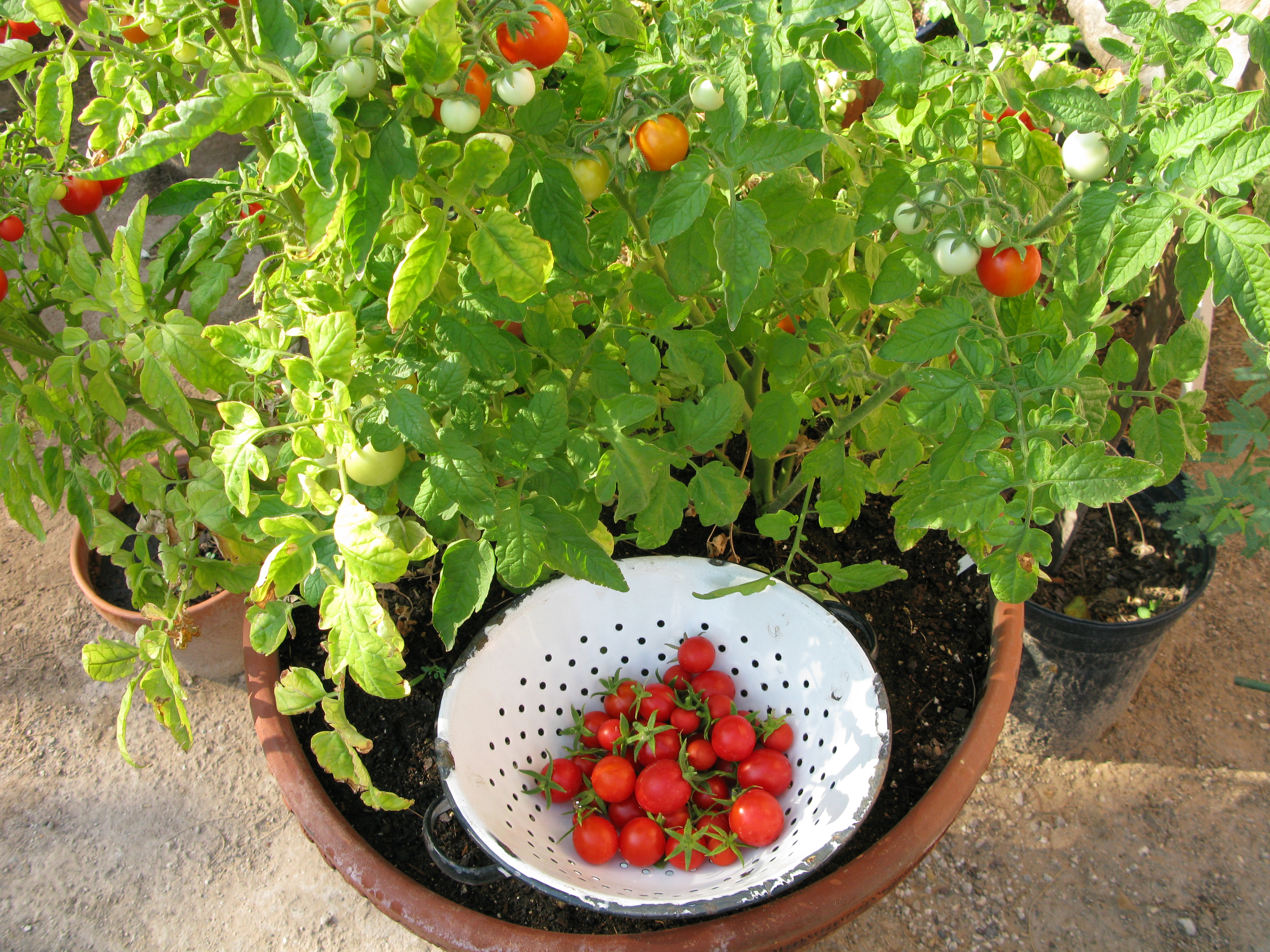Because of the of  the sacrifices a tomato plant makes, suffering through the feasting of voracious tomato hornworm, I hate to let  any of the the end of summer green or harder red  fruit go to waste.  Because I love to love to grow smaller “cherry” style tomatoes, it is those that I most eat and cook with.   Here in the desert it just makes sense to follow Nature’s lead, and plants with smaller leaves and fruit  tend to thrive.  This is a survival strategy for a harsh desert environment. Each time a plant opens its pores, which it does in transpiration, it looses water. Replacing the water is critical, so the smaller the surface area the less water is lost and more.   “Cherry” tomatoes, like the Punta Banda, Chiapas, or wild Texas varieties (you can get seed at Native Seeds SEARCH) are prolific!  Cherry-tomato plants, in my experience, require less water. And they produce and produce and produce; I have enjoyed the fruit of the Chiapas Tomatoes (some years) throughout  Nov/and even December!
