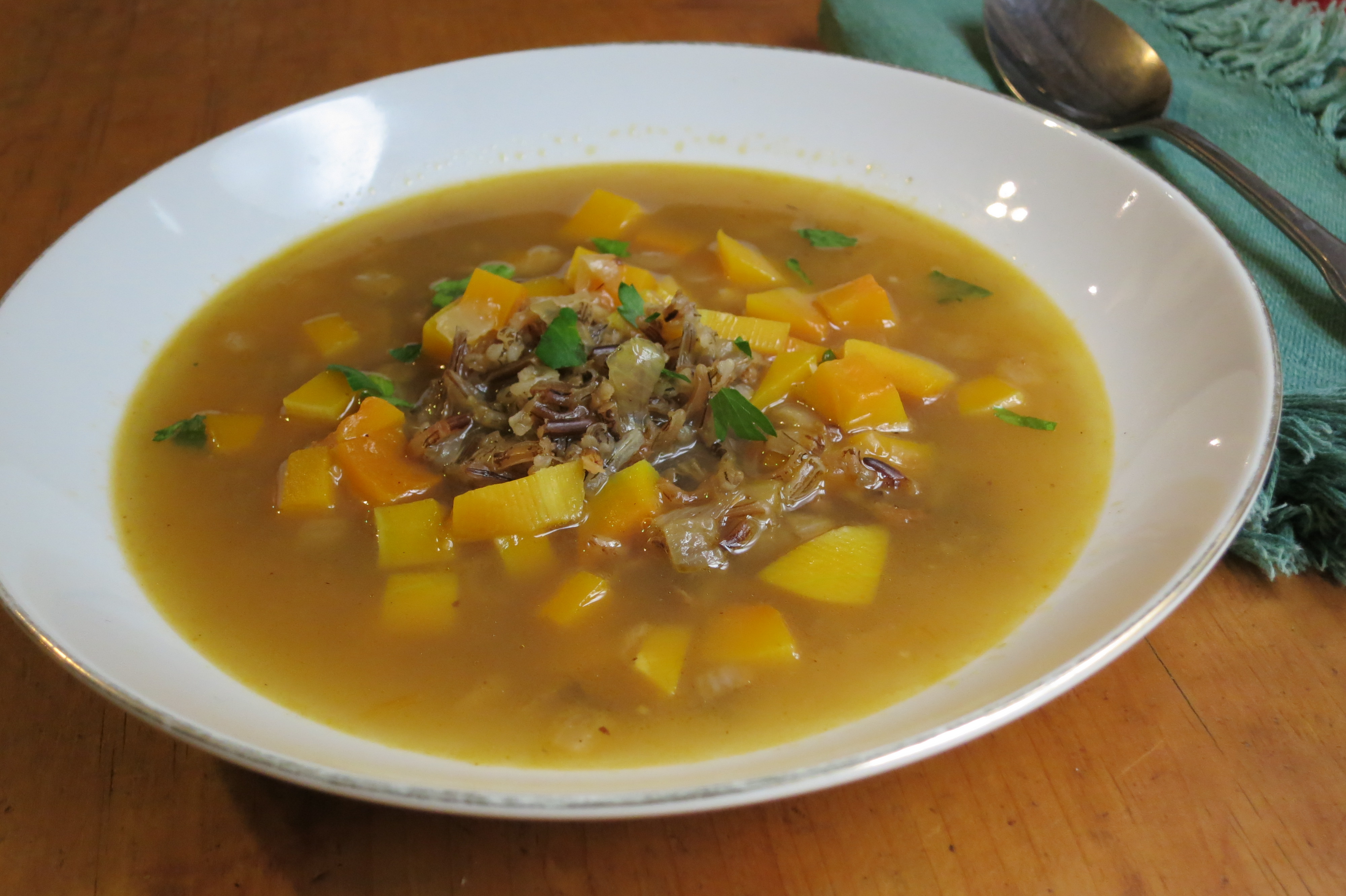 We browned a chopped onion in olive oil with a bay leaf, then added a couple cloves of garlic and a tablespoon of Mole Dulce powder. We cooked it until fragrant, then added a quart of homemade turkey broth. A handful of Minnesota wild rice from a friend’s a summer trip simmered in the broth, as well half a butternut squash from the Tucson CSA. Salt and pepper to taste. When tender, we garnished with parsley.
