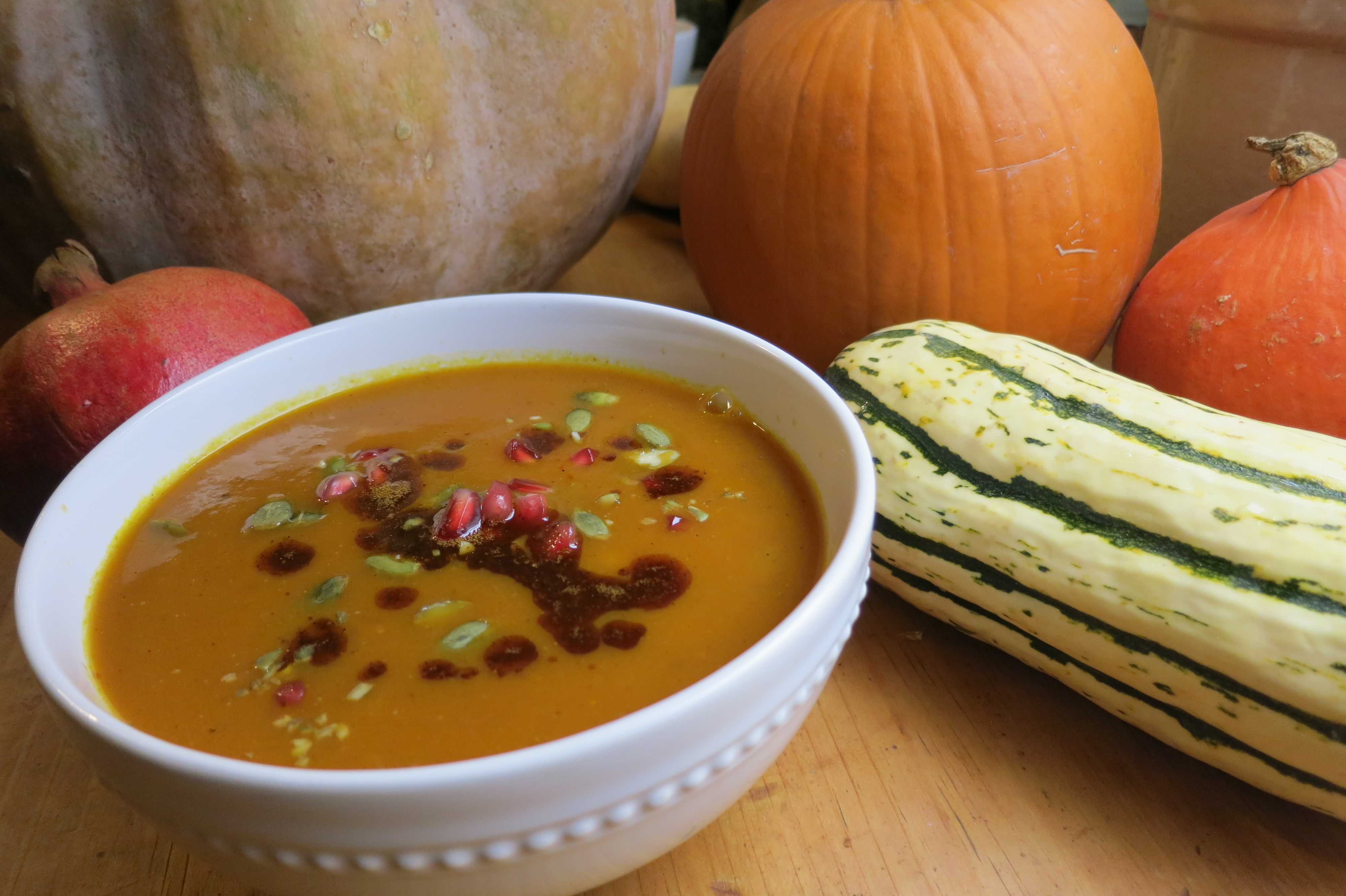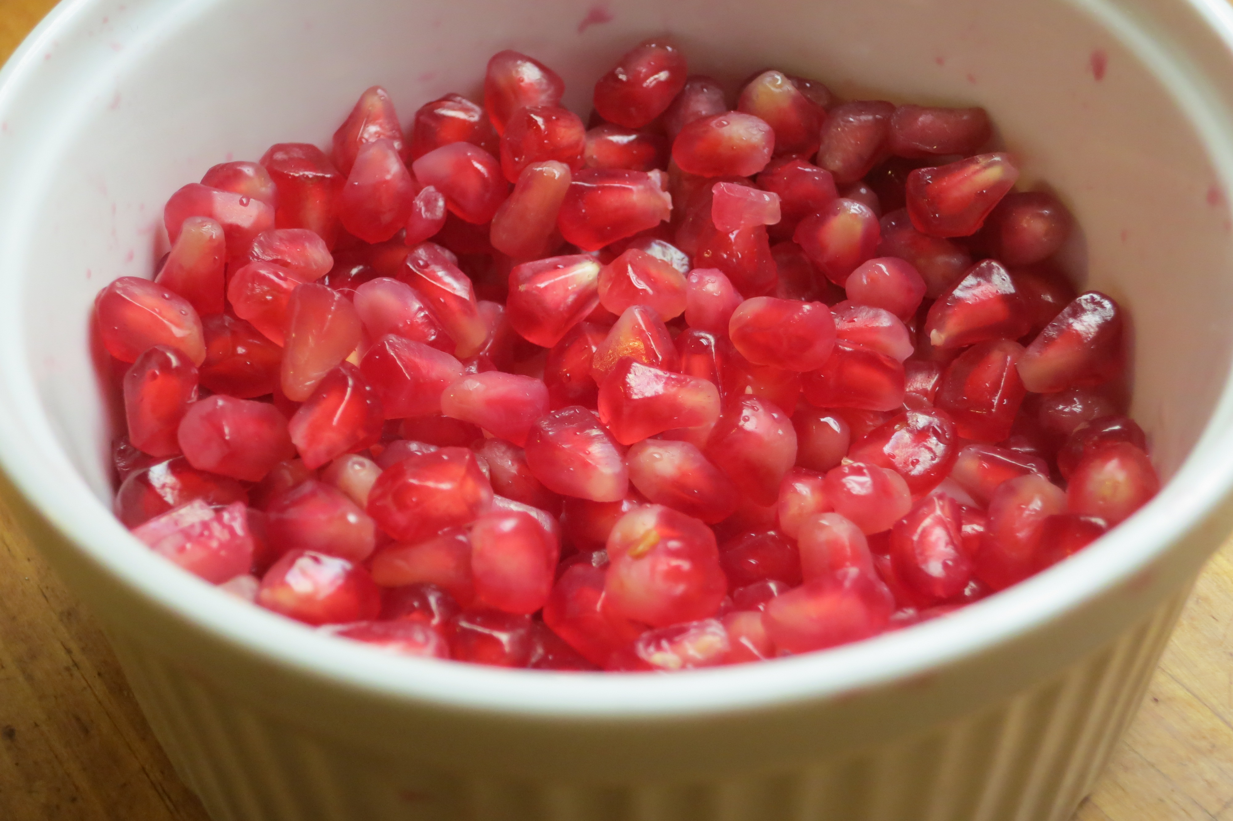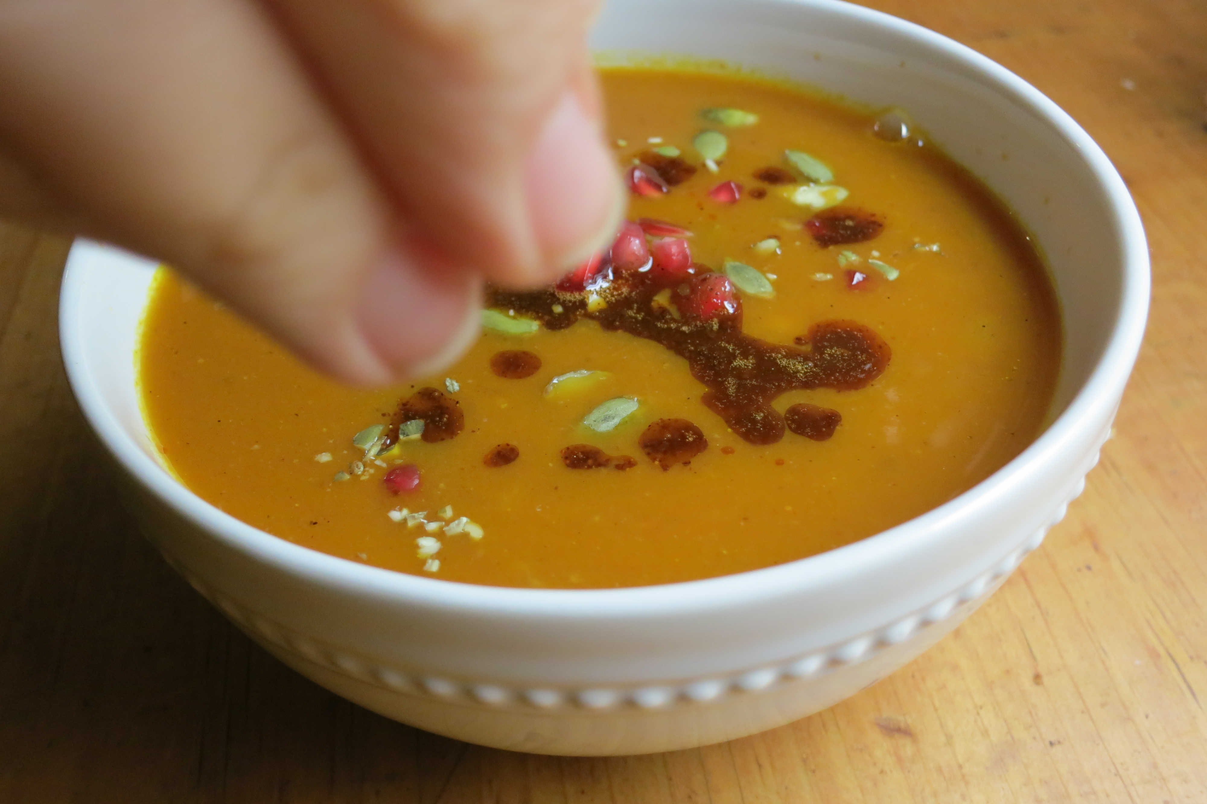 Starting with the same base of onion, bay leaf, garlic and Mole Dulce, we added cooked, pureed hubard squash and more turkey broth. It didn’t seem like enough spice, so we added more Mole Dulce powder and some ground ginger and turmeric. A tiny touch of honey brought it together, salt and pepper to taste. What really made this soup was Laura’s garnish inspiration. Fresh pomegranate arils and hulled pumpkin seeds added texture. The pomegranate’s cool, juicy tartness contrasted with the hot, sweet, creamy squash.
