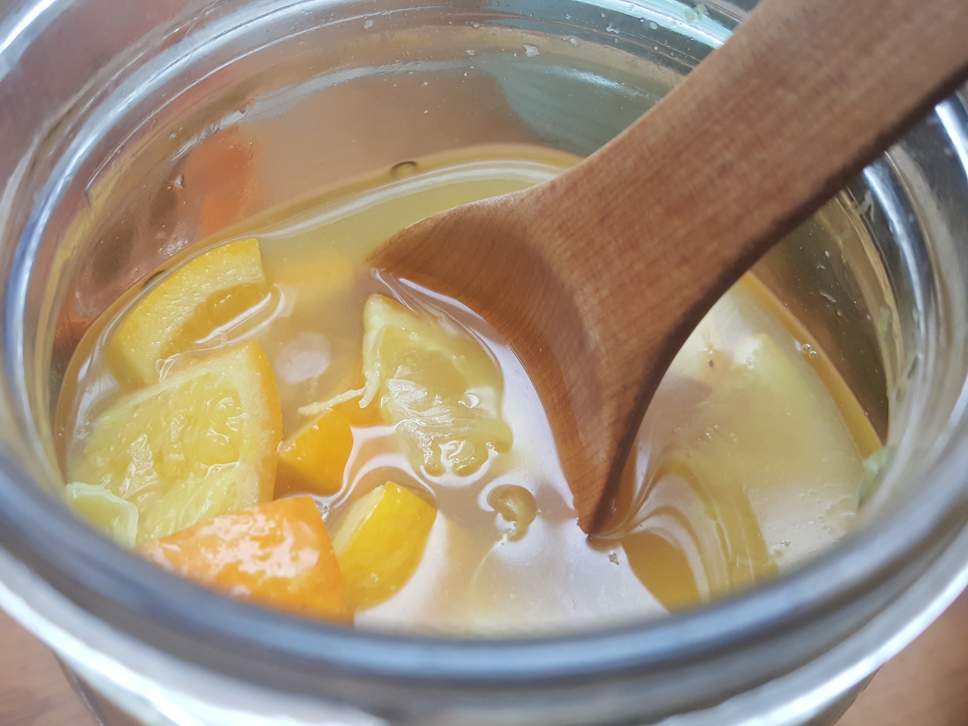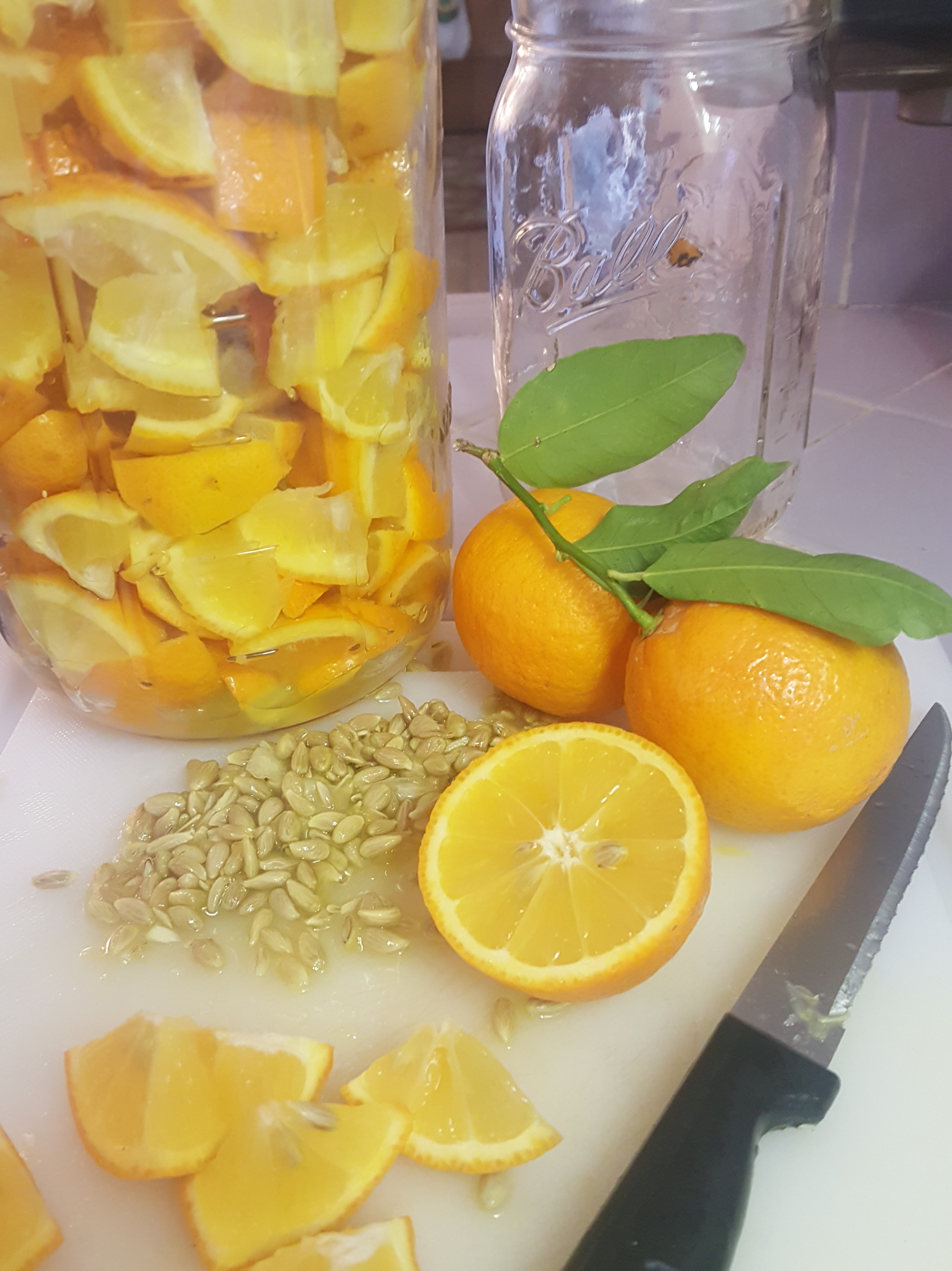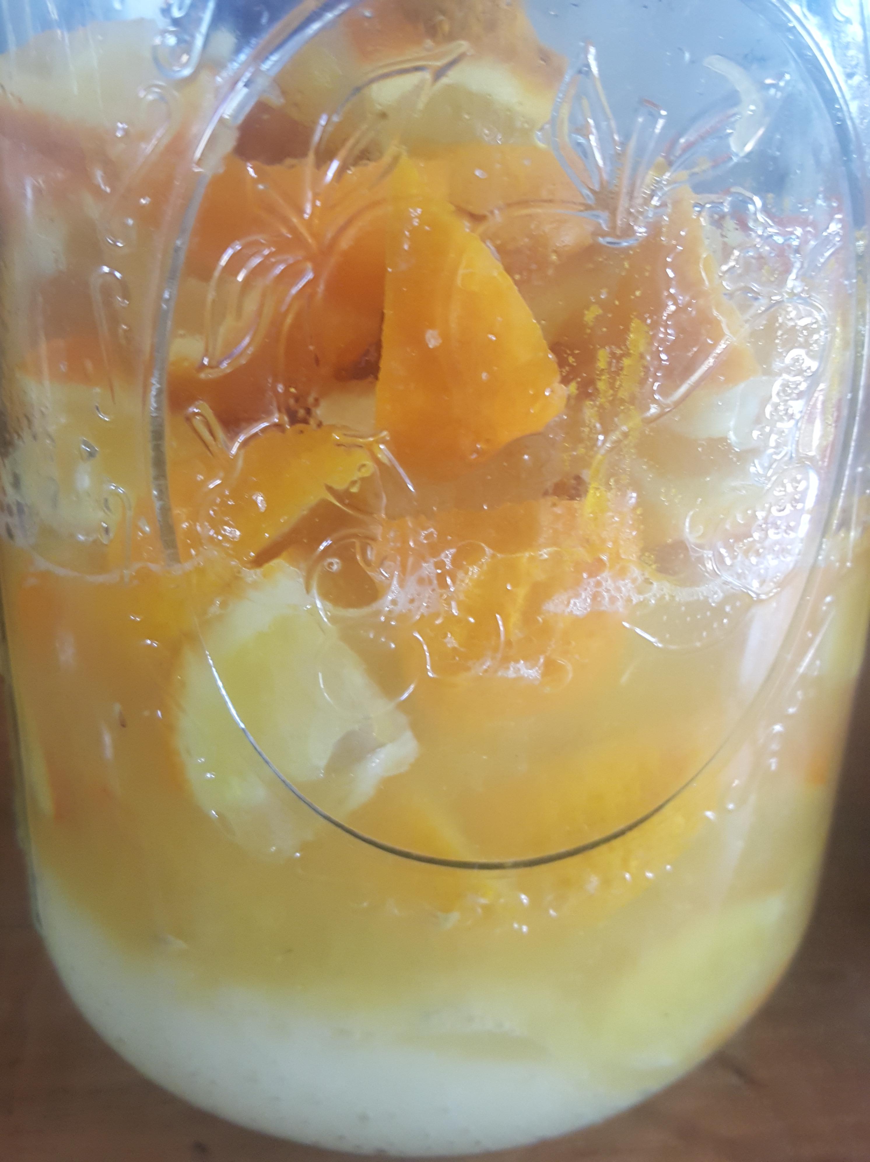 I chopped three heaping cups of sour citrus and added one tablespoon salt, half a cup filtered water, a quarter cup evaporated cane juice (granulated sugar would be fine) and one quarter cup whey (drained from yogurt) as a starter culture. Fruit normally has enough beneficial Lactobacillus cultures and the salt favors their growth over the harmful microorganisms. However, I followed the recipe since this jar had lower salt concentration and added sugar. (The sugar favors different beneficial cultures to grow.) After sitting for a couple weeks and stirring daily, it was slightly fizzy and delicious!