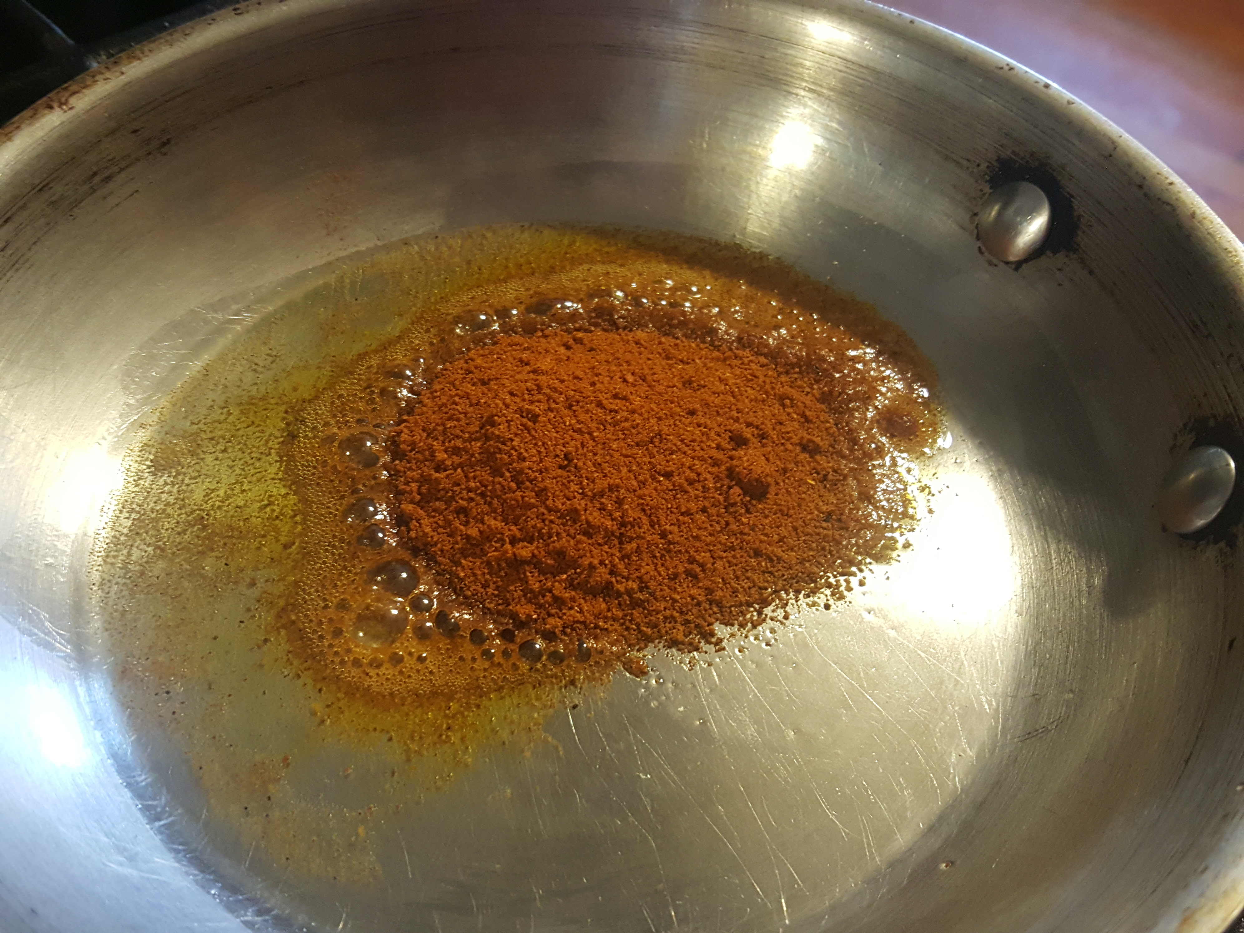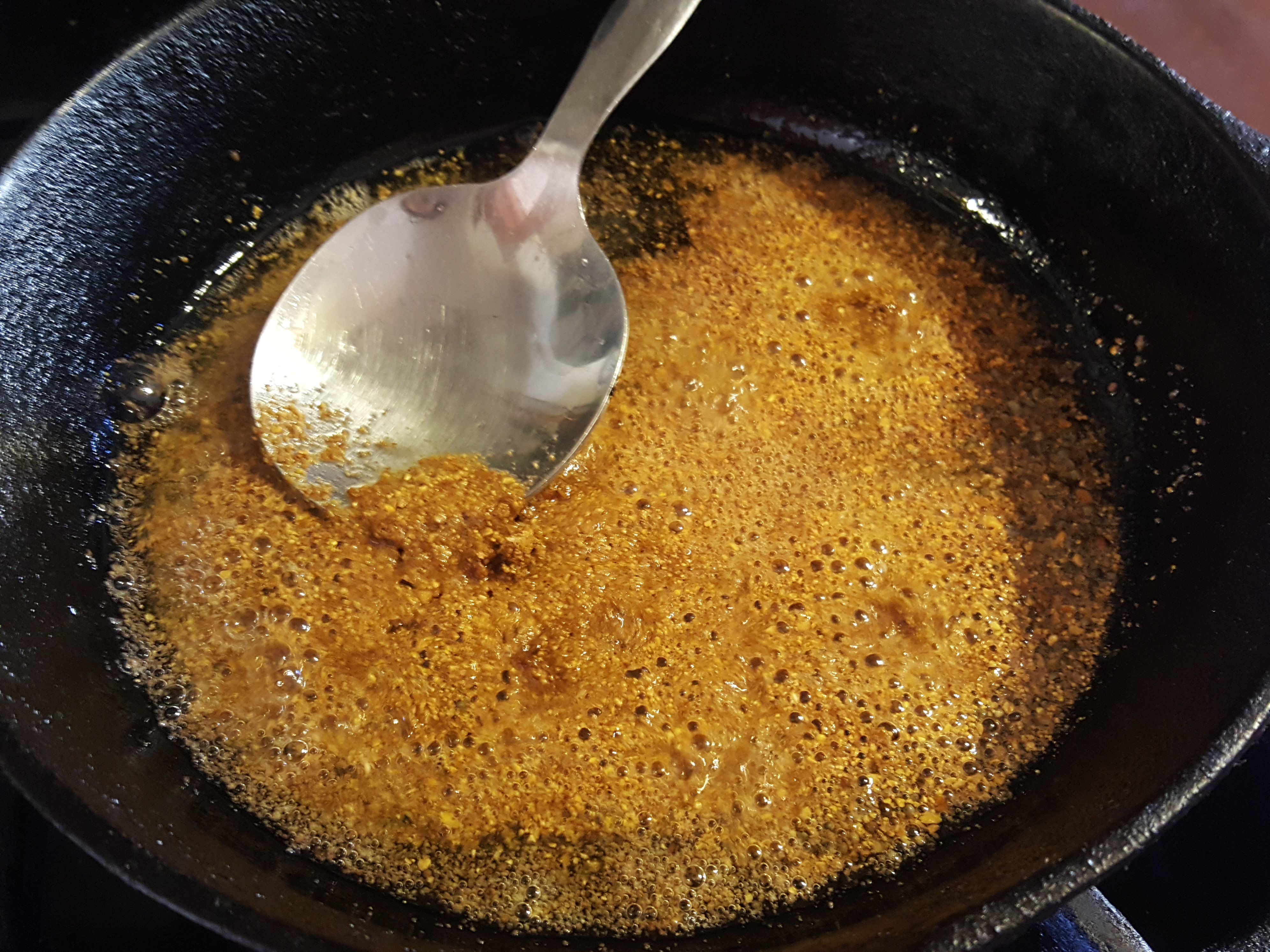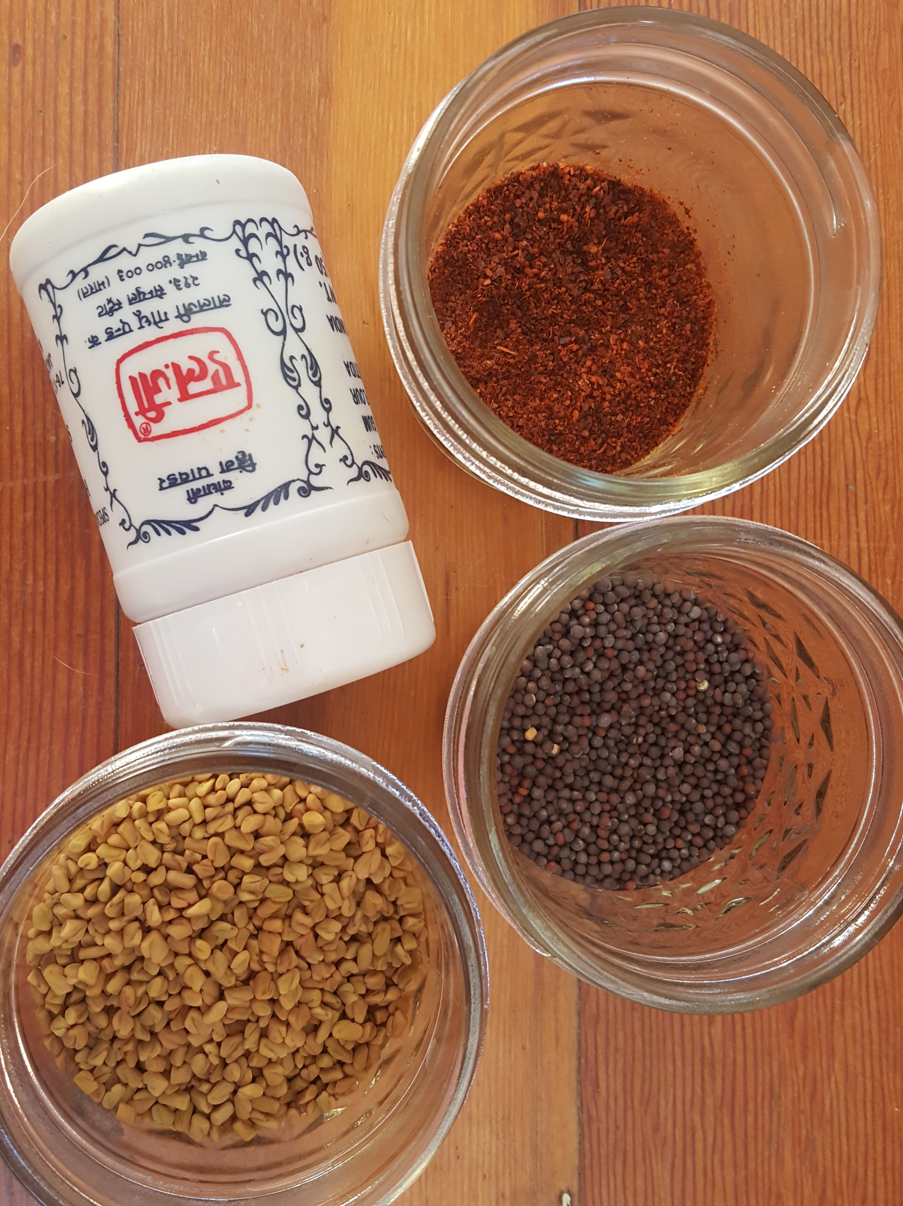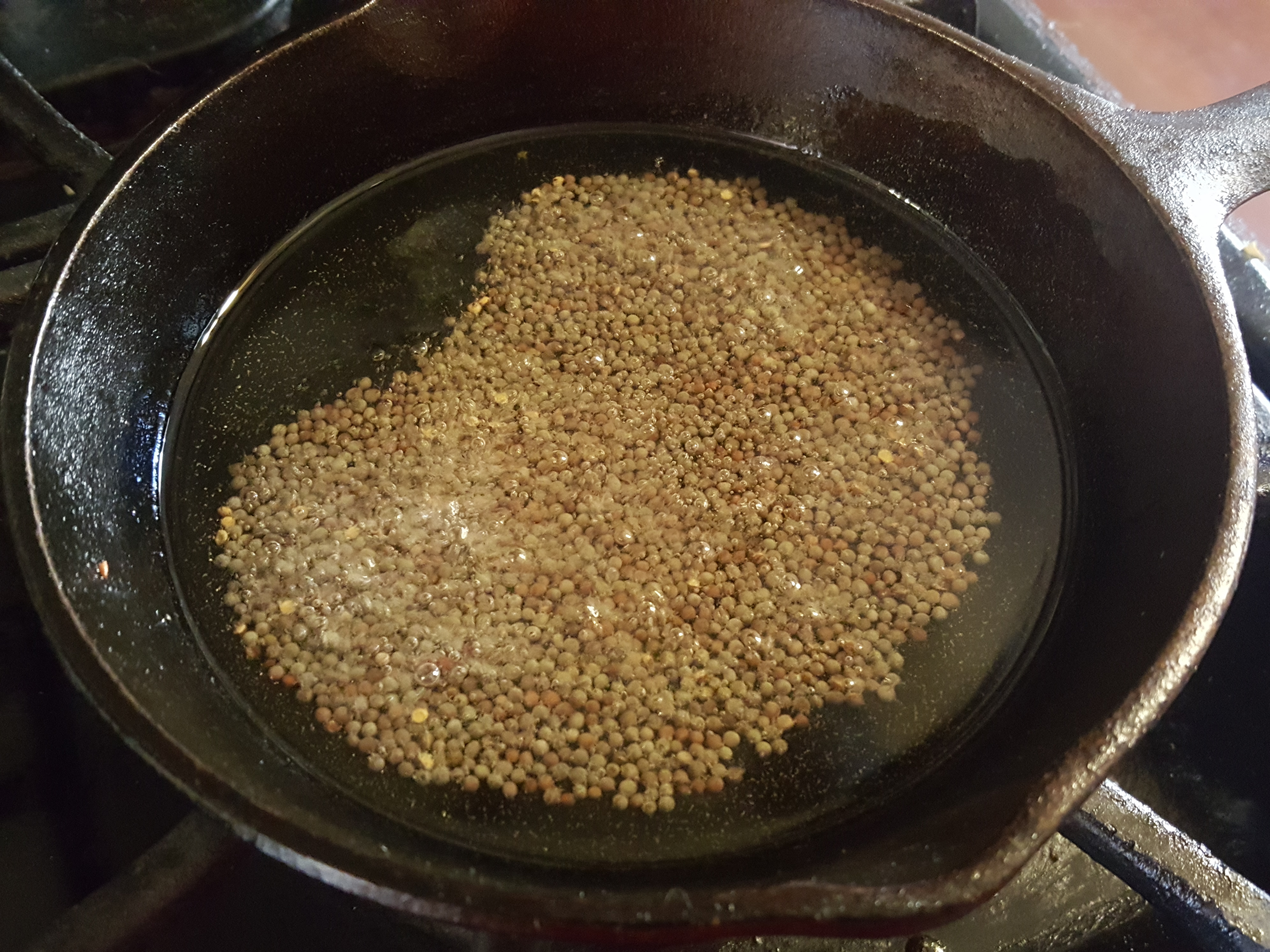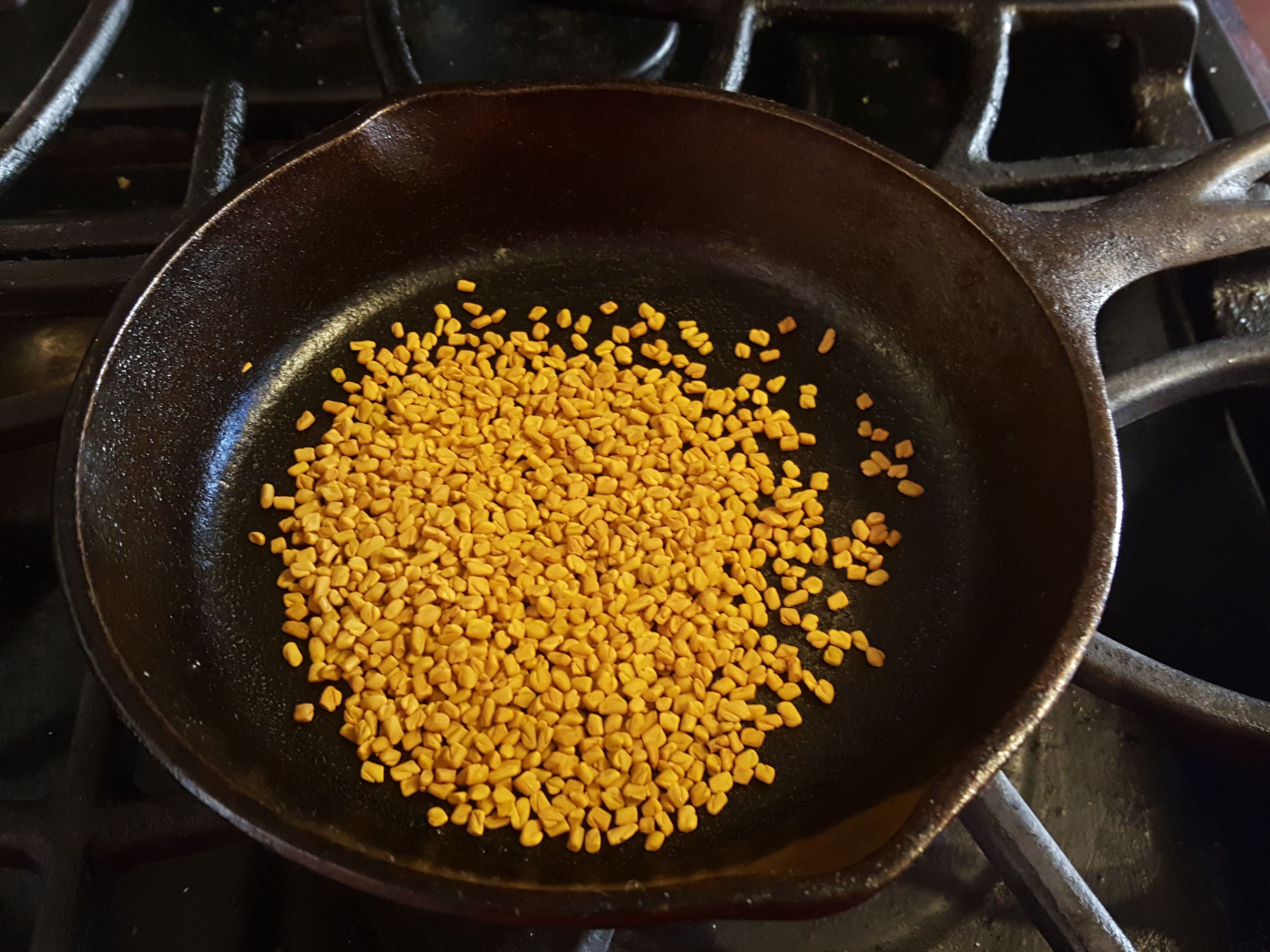Dry toast fenugreek seed (1 tablespoon), cool and grind. Gently heat oil (3 tablespoons) and cook black mustard seeds (half teaspoon) until they sputter! Turn down the heat and add asafoetida powder (1 teaspoon) and the prepared fenugreek. Cook briefly while stirring.
