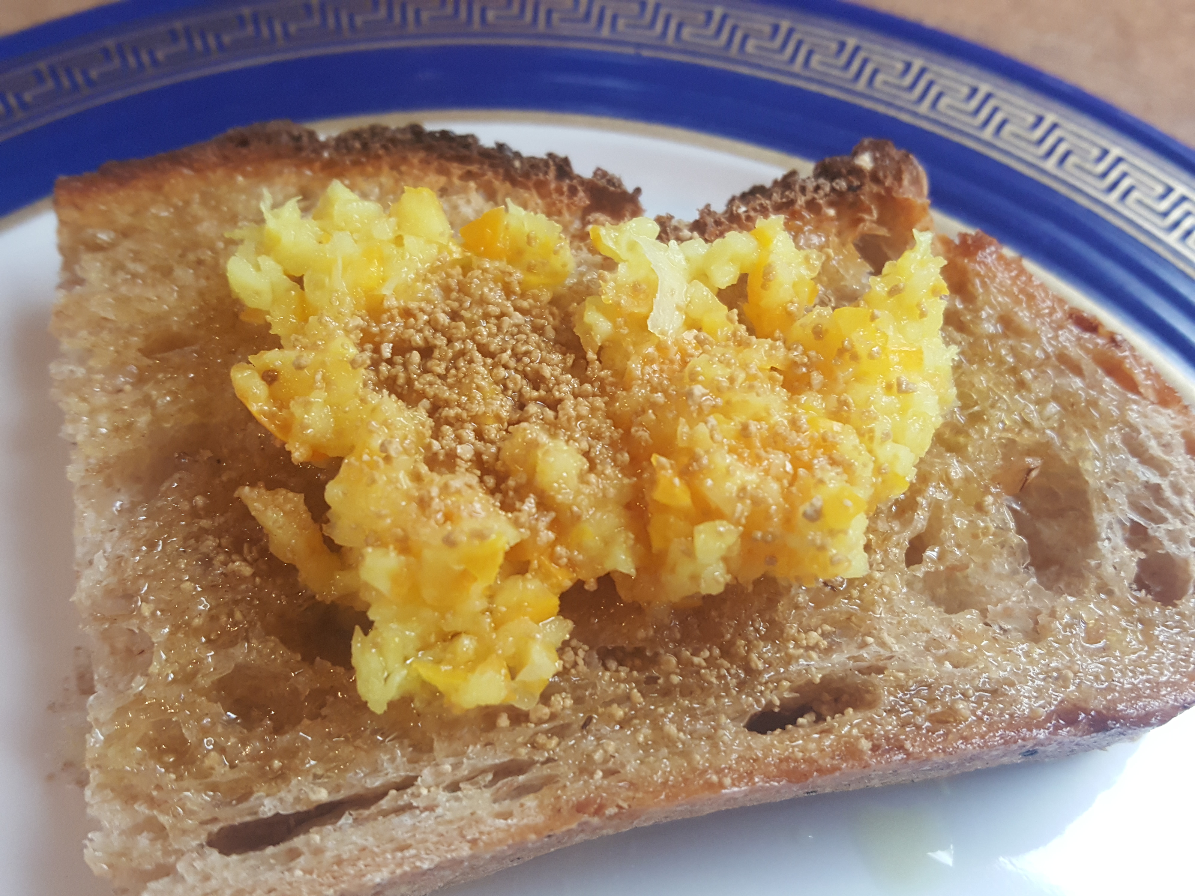 I made some with sliced fruit and some with fruit chopped in the food processor. The barely salty “brine” was less sour than the ferments in sour juice, slightly sweet, and tasty to sip! We ate the softened fruit on buttered toast, with or without additional evaporated cane juice sprinkled on top. Honey would be good, too.