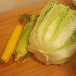 No matter how beautiful local veggies are, dreaming up something new and exciting to make with the same characters over and over again can be a challenge. Amy here with my latest attempt to use beautiful Tucson CSA napa cabbage (Sleeping Frog Farm) and summer squash (Crooked Sky Farm). And what to do when you have only ONE tiny ear of sweet corn? I also had ripe serrano chiles from a friend and a handful of blanched tender Foothills Palo Verde seeds. See Martha’s post for more on desert legumes.
