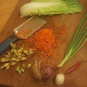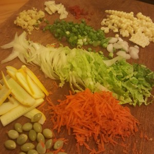 Cut all the veggies. This is not the dish to start cooking the longer cooking items before you cut the others. The original recipe called for spring onion and a little fresh ginger. I used carrot, cabbage, golden zucchini, young onion tops and bottoms, sweet corn and tender blanched palo verde seeds. For spice, I used garlic, ripe serrano and lots of ginger.