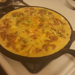 Gently heat a well seasoned cast iron or nonstick pan with low or rounded sides. Splash on a bit of cooking oil and toasted sesame oil. Add the meat and veggies in an even layer and pour the eggs over all. Cook gently until almost set and browning on the bottom. Slide onto a plate. Cover with a another plate and invert. Slide back onto the pan and cook through. If there are more veggies than the eggs can hold together, it will be messy. The book suggests cutting in wedges and flipping each, but it is not as pretty.
