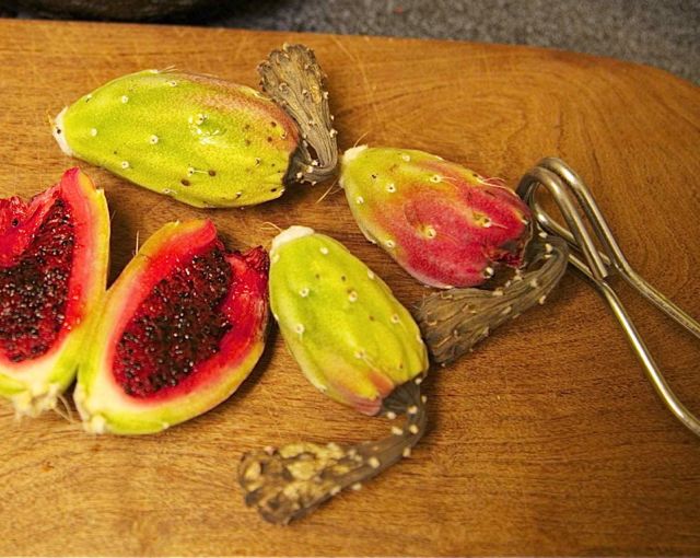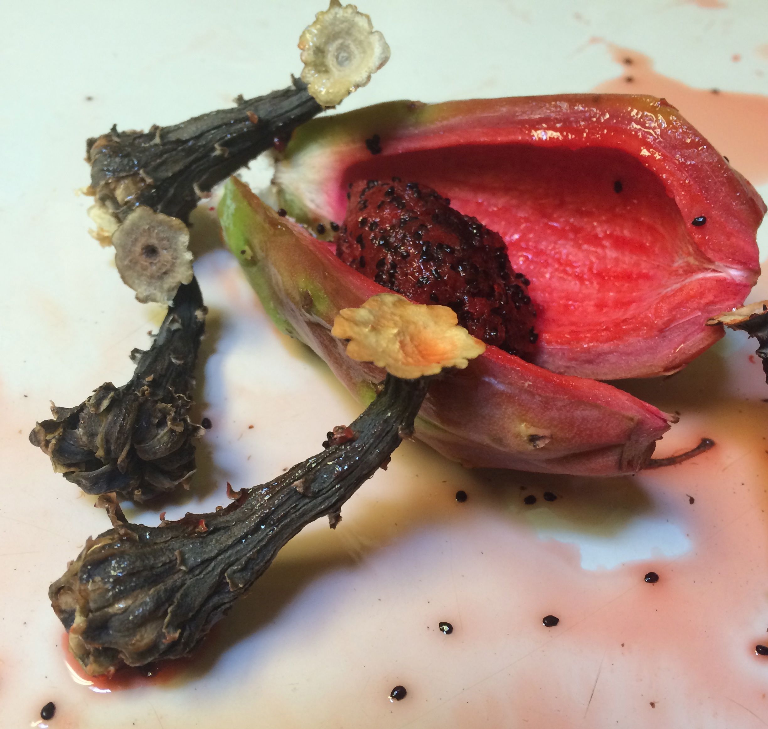A saguaro fruit, opened with its sharp “pizza-cutter” calyx, is filled with sweet raspberry-red pulp and crunchy black seeds. (MABurgess photo)