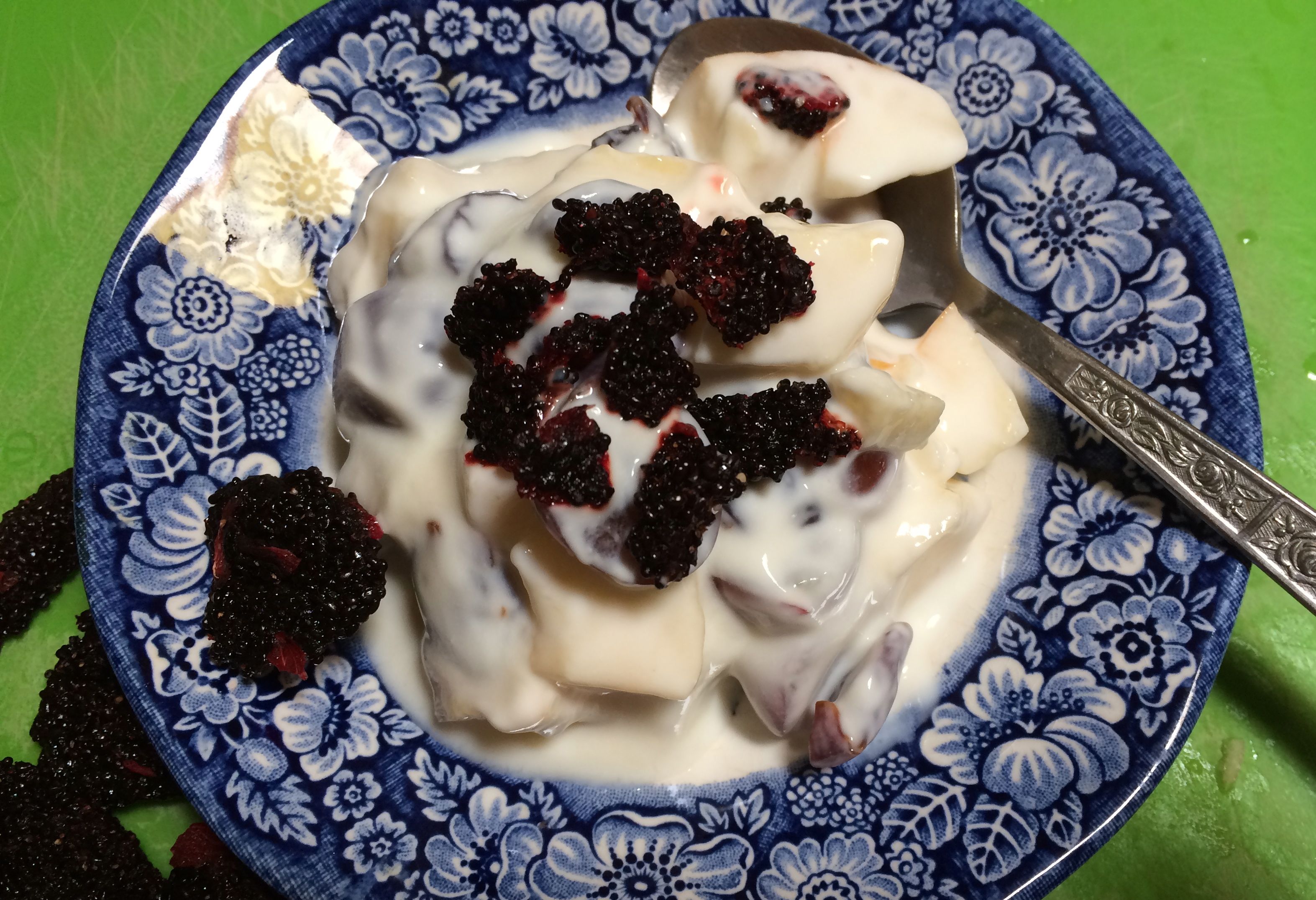 Mix all ingredients except chuñ ahead and chill. Sprinkle some little chuñ chunks on each serving as topping. Serves 2 or 3. This is fancy and sweet enough to be used as a dessert. Enjoy the natural complex carbs, sweet nutrition, and delightful crunch!