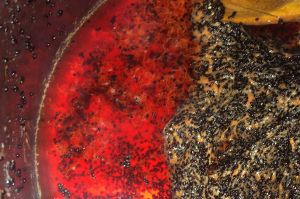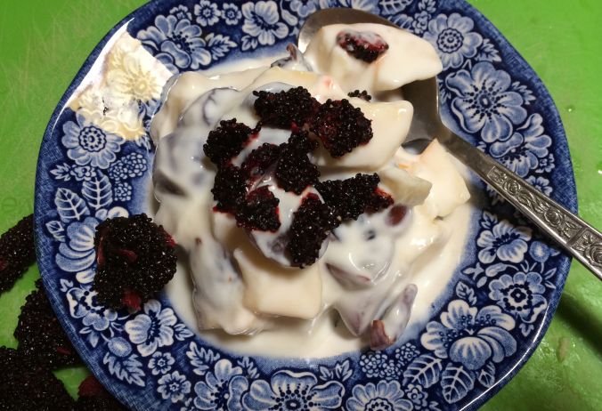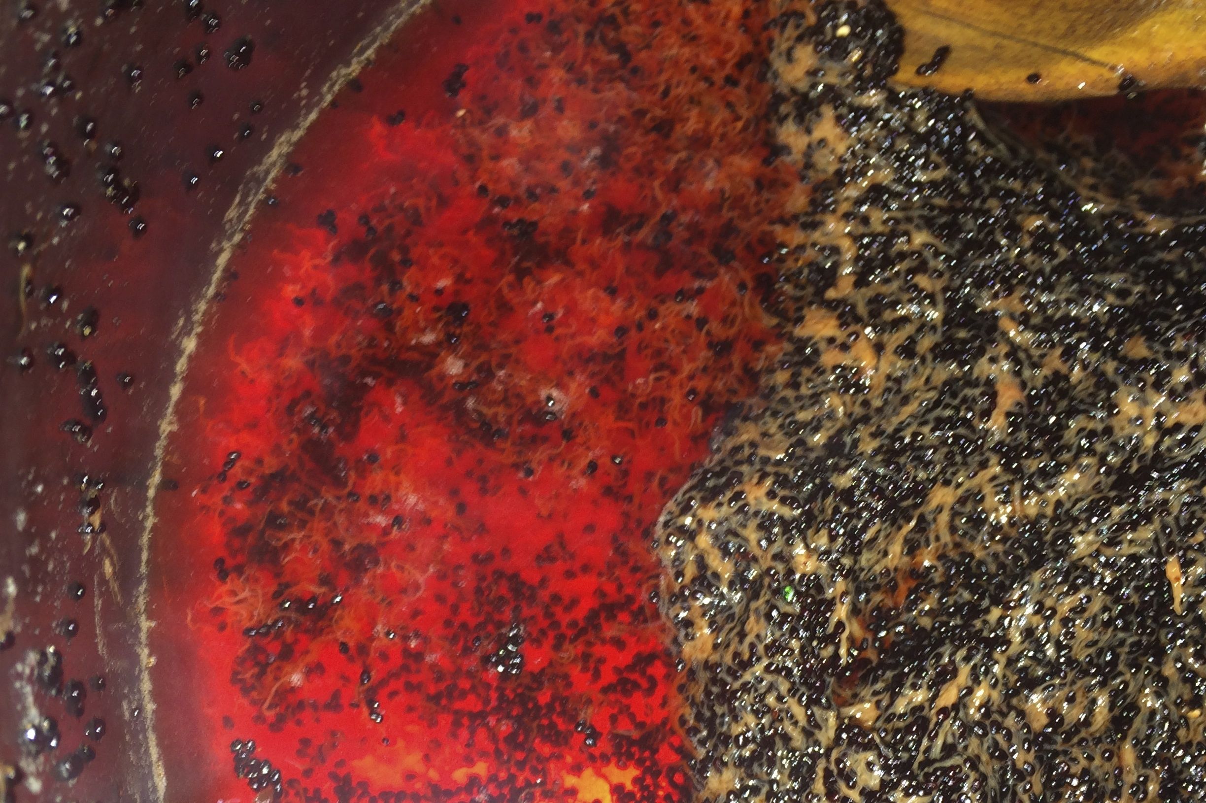 Juanita would add water to the pulpy fruit to loosen the mass, then strain out seeds before concentrating the sweet water to syrup. (MABurgess photo)