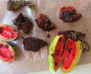 I also love to make chuñ–the dried bahidaj fruit which you can sometimes find hanging on the branches of a palo verde, the nurse tree next to the saguaro where fruit has fallen. Scoop out the pulp from its rind, place blobs on wax paper, dry them outside under a screen or in your solar oven. Eat and enjoy chuñ as a totally healthy snack; it is high in complex, slowly-digested sugars, vegetable protein and healthy oils in the seeds. Or, get creative with chuñ–as in the following recipe: