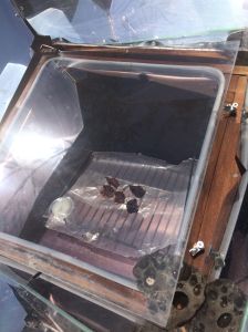 Try dehydrating saguaro fruit in a solar oven with the lid partially open to allow moisture to escape. It doesn’t take long. Note the rock holding the oven cover open.(MABurgess photo)