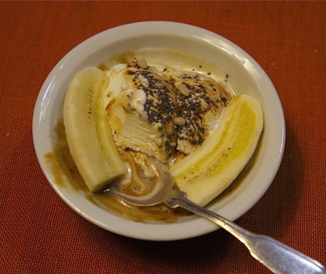 Divide a half banana in half longitudinally. Serve a big scoop of ice cream in between–any flavor– like chocolate chip or French vanilla. Top with saguaro syrup, seeds and nuts of choice. [Here the “lily is guilded” for sure. Who needs a cherry on top when you have the rare treat of saguaro syrup?!]