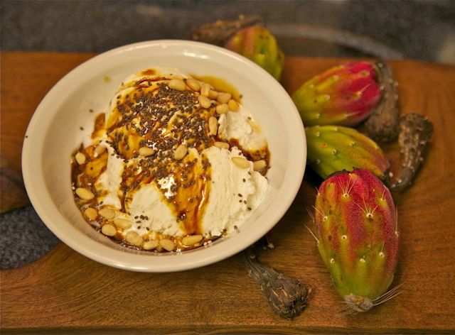 Over a serving of vanilla or vanilla-bean ice cream, pour 1-3 tsp pure saguaro syrup (bahidaj sitol). It doesn’t take much, as it is so rich! Sprinkle top with 1/2 tsp chia seed and 1 Tbsp of pine nuts (shelled). Taste and go nuts in ecstasy!