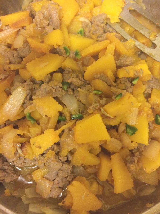 Carrying the stir-fry of heirloom pumpkin to the next level, try it in a stir-fry one-dish meal with meat.  Here I have sautéed ground turkey before adding it to the Mayo Blusher and onion stir-fry.  Add fresh diced green peppers or diced I’itoi’s onions for color and flavor–or if you have a picante palate, dice a jalapeño into the entire dish, gradually testing it to your own level of “heat.”  This is an innovative use of left-over turkey a few days after Thanksgiving.