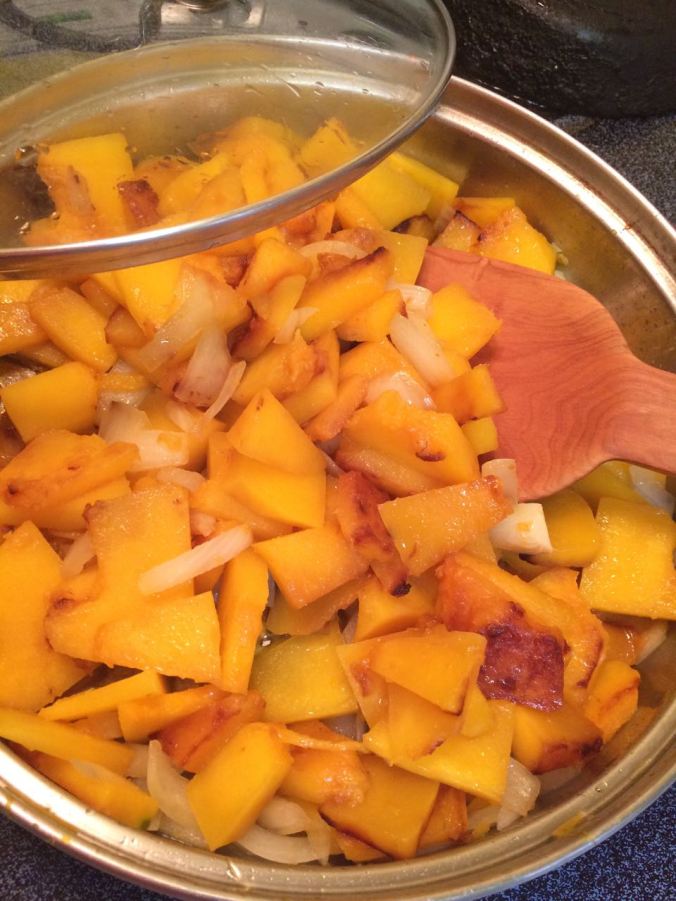 Winter Pumpkin stir-fry–Skin and dice fresh Mayo Blusher (or any hefty heirloom winter squash) into chunks to stir-fry with onion or garlic. Enjoy as is, or add herbs and other veggies as desired. Don’t be hesitant to even try adding curry to this stir-fry for a healthy pizzaz.  Yum!  (MABurgess photo)