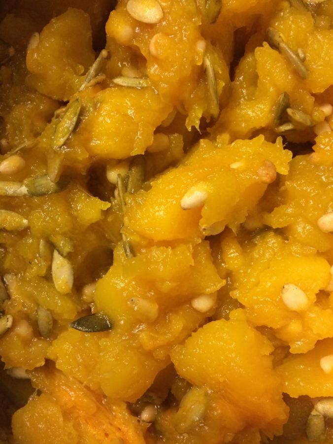 With roasted or steamed Mayo Blusher (or other pumpkin heirloom) you can make a slightly sweet dish pleasing to a younger palate.  Add agave nectar to taste, pine nuts and/or pumpkin seeds to add crunchy texture.  (MABurgess photo)