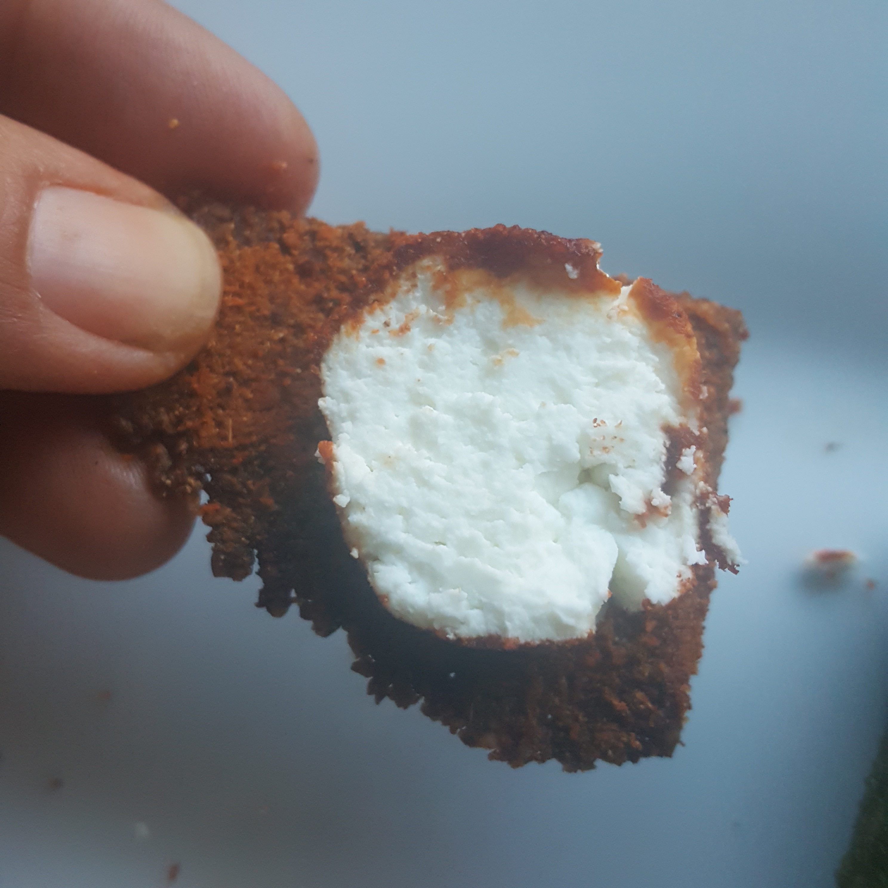 Later in the season, David will send us cheese rolled in herbs, or green chile, or chipotle. Since this chevre was plain, I decided to roll some in Mano Y Metate Mole Verde powder and some in Pipian Picante.