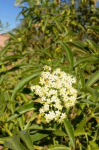 Native Mexican elderberry–sauco in Spanish (Sambucus mexicana)–makes an effective screen as a shrubby, dense tree. It bears cream colored flower nosegays that become clusters of dark berries (tasty but toxic unless cooked). Its flowers and foliage have been used also for curbing fever and as a diuretic. (MABurgess photo)