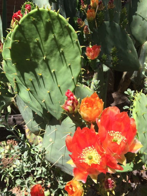 This showy orange-flowered prickly pear, collected by Dr Mark Dimmitt in the Chihuahuan Desert (Opuntia lindheimeri), is now a favorite in desert gardens all over Baja Arizona. Plentiful young pads of all prickly pears (flat new stems called nopales in Spanish, nowh in Tohono O’odham)–are an important traditional source of blood-sugar-balancing mucilage plus available calcium for bones or lactation, when prepared properly. (MABurgess photo)
