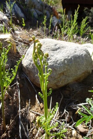 As long as I’ve been writing about wild foods–and that is many decades–I’ve read about eating the just-emerging shoots of ferns, a great delicacy. But since practically all of my foraging has been in the desert, I’ve never had a chance to gather this mountain treat. Then last year, we became part owners of a cabin on Mt. Lemmon, next to Tucson, at 8,000 feet. The hill behind the cabin is covered with FERNS due to a fire on the mountain about 15 years ago. As soon as I saw them last summer, I began plotting my gathering experience.