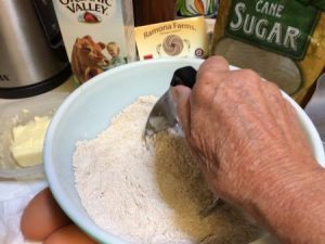 Organic eggs, organic mild, Ramona’s roasted heirloom wheat, and raw organic sugar assembled for scone-making. Cut in cold butter into golden white Sonora Wheat mixture.