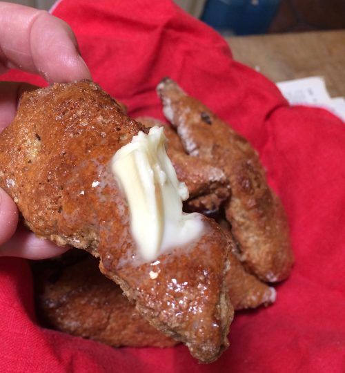 Piping hot with butter–Muff’s date scones made with Ramona Farms roasted O’las Pilkan Chui (Pima Club wheat flour roasted), kamut flour, and chopped Dateland dates.  Who needs clotted cream or lemon curd when it tastes so good already?
