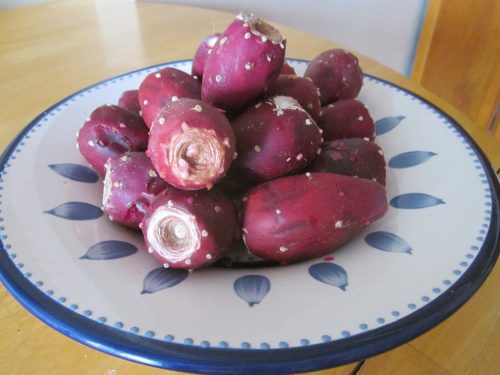 Using tongs, collect 18-24 prickly pears. Wearing rubber gloves, rinse fruit and quarter. Working in batches, puree fruit in a blender. You’ll need to add a little water to get the first batch started. Strain through a fine mesh strainer and discard solids. The thorns will get caught in the strainer.