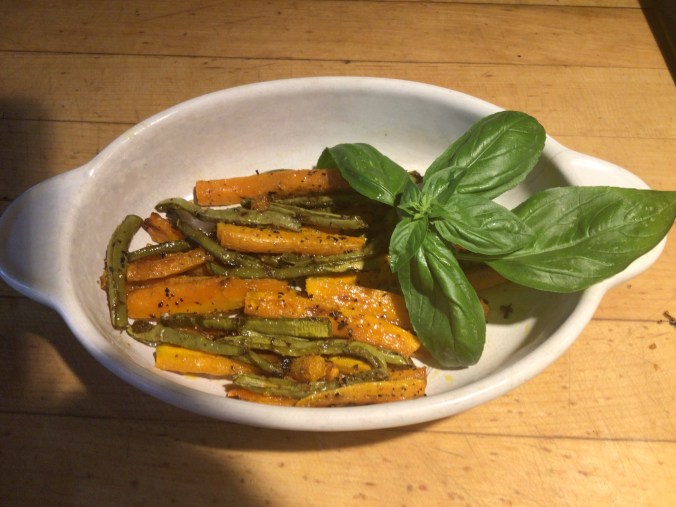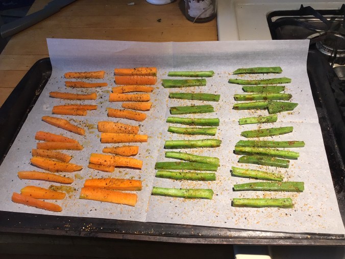 Put the cut vegetables in a small bowl and drizzle in a little olive oil and toss to cover. Arrange on a cookie sheet lined with parchment paper or aluminum foil. Sprinkle with your favorite spices. I used seasoned salt, pepper, and Trader Joe’s citrus-garlic mix. Be generous as this will give your finished dish vibrant flavor. Bake in a 400 degree oven for 20 minutes.