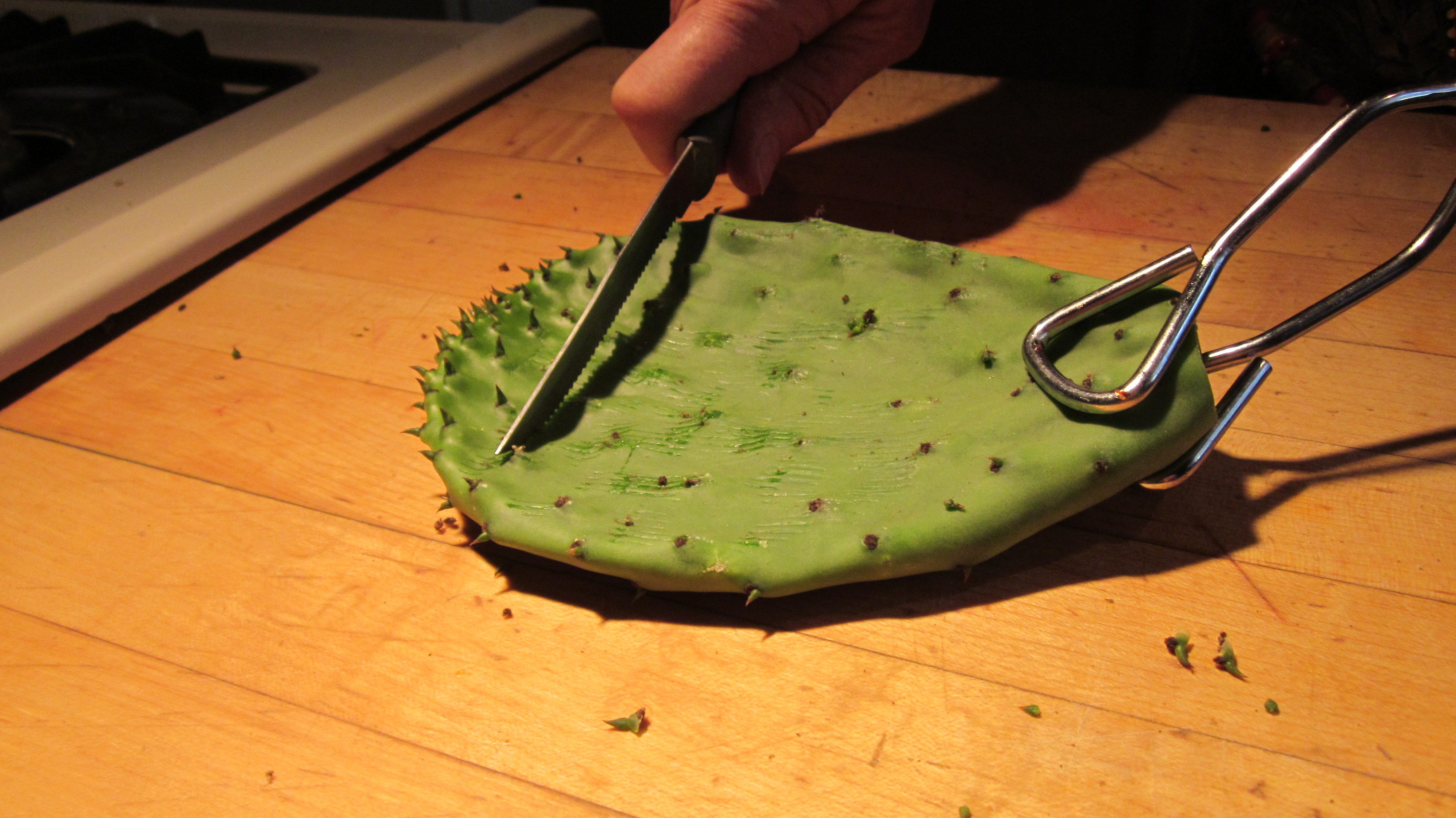 First, you’ll have to clean the prickly pear pad. Using gloves, scrape against the stickers using a steak knive and rinse to made sure they are clean.