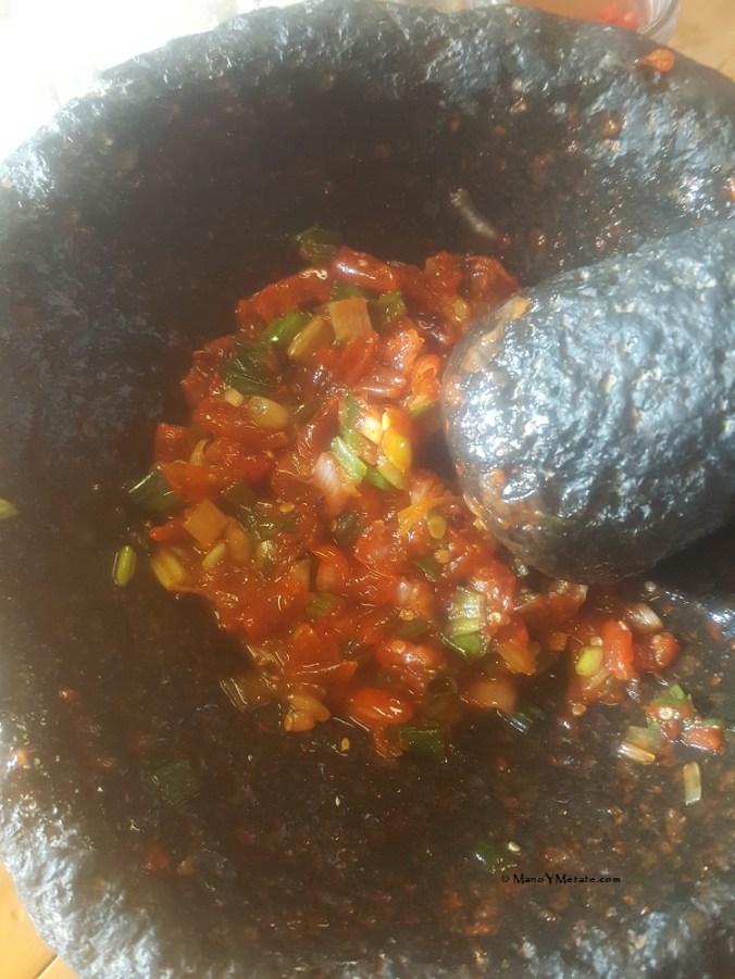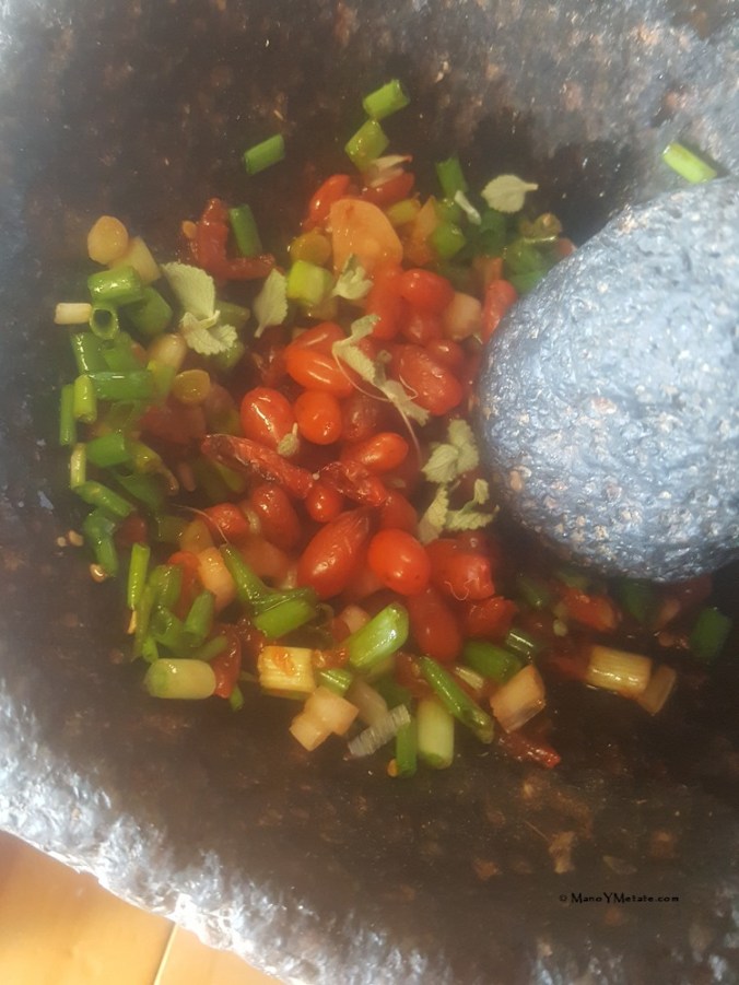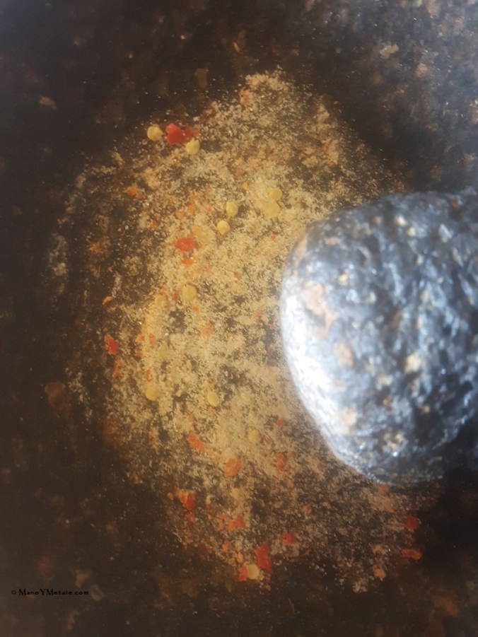 In the molcajete, I started with the chiltepin and salt.