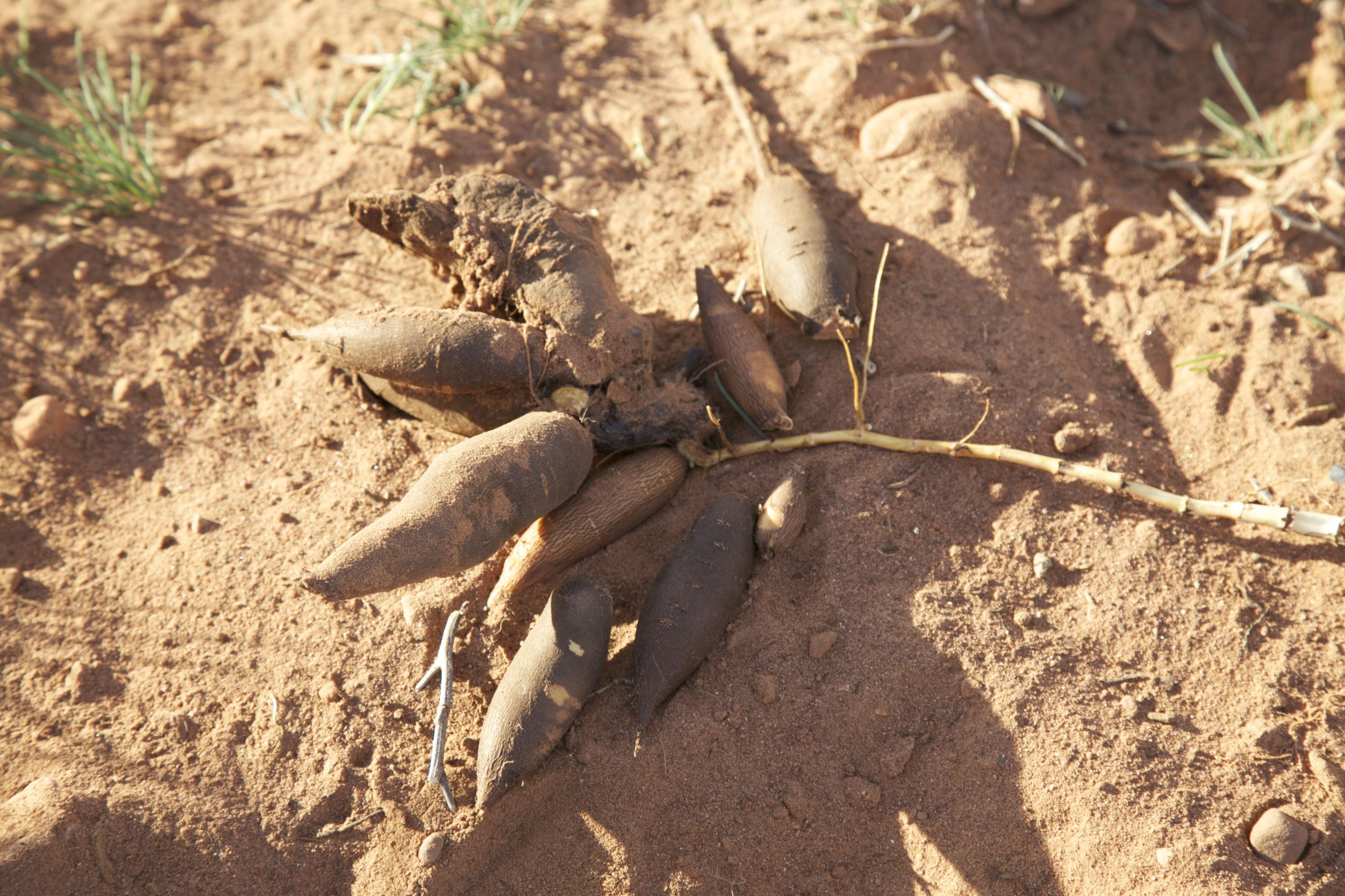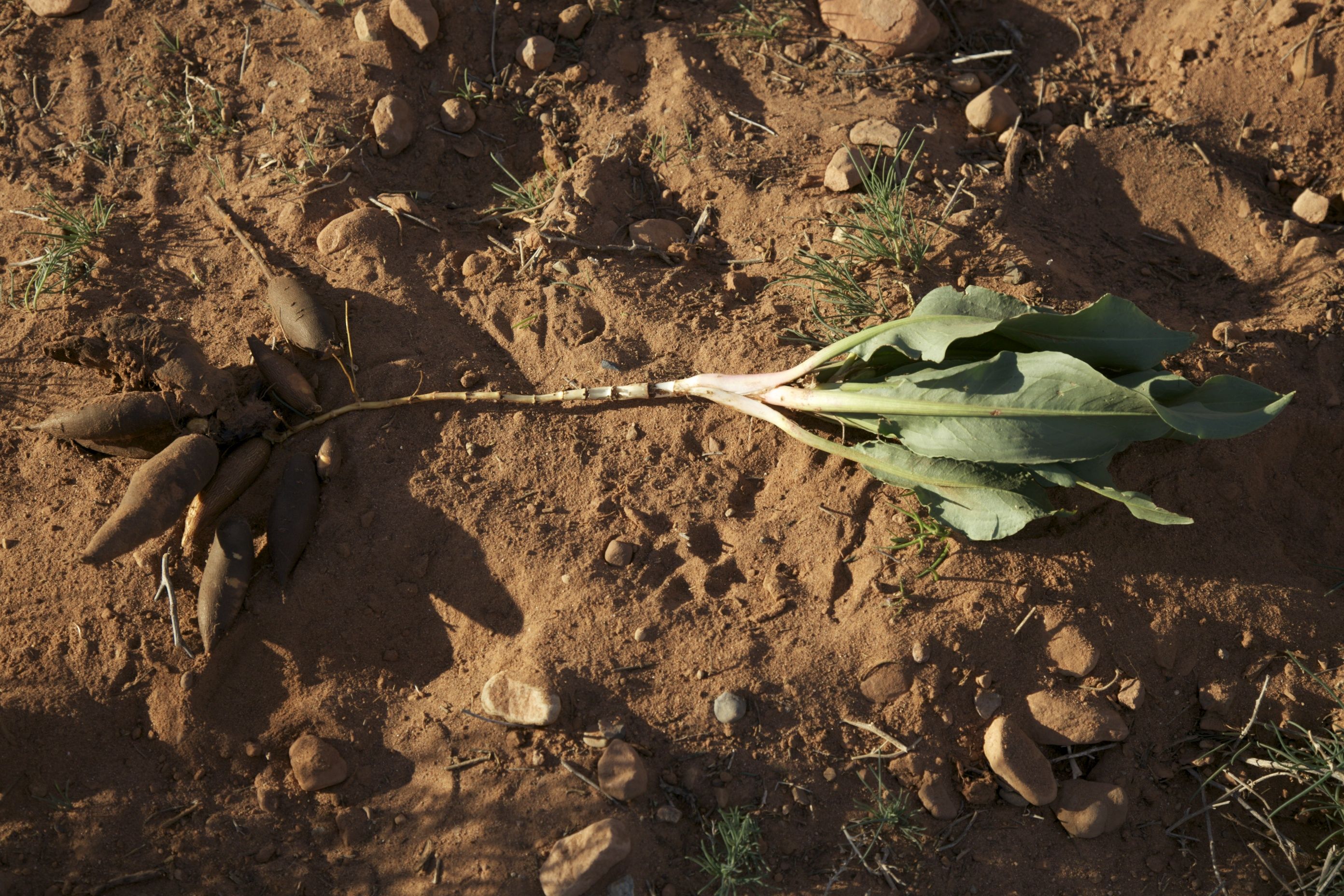 Juanita would also dig deeply into the sandy soil directly under an unusually large, robust hiwidchuls to harvest one or more (up to maybe 1/4 of the tubers) to use as medicine.  I recall her digging a big purplish tuber the size of an oblong sweet potato at a depth of 2 1/2 feet on the floodplain of the Rio Santa Cruz where ball parks now prevent any hiwidchuls growth at all.  She would dry it and powder it to use later on scrapes to staunch bleeding.  Her hiwidchuls harvesting dress was dotted with rosy brown patches of color dyed from the juice splashed on the cloth when she cut the tubers into slices for drying. (See Jacqueline Soule’s post on this blog from 2014, also Michael Moore’s Medicinal Plants books, for alternate uses.)