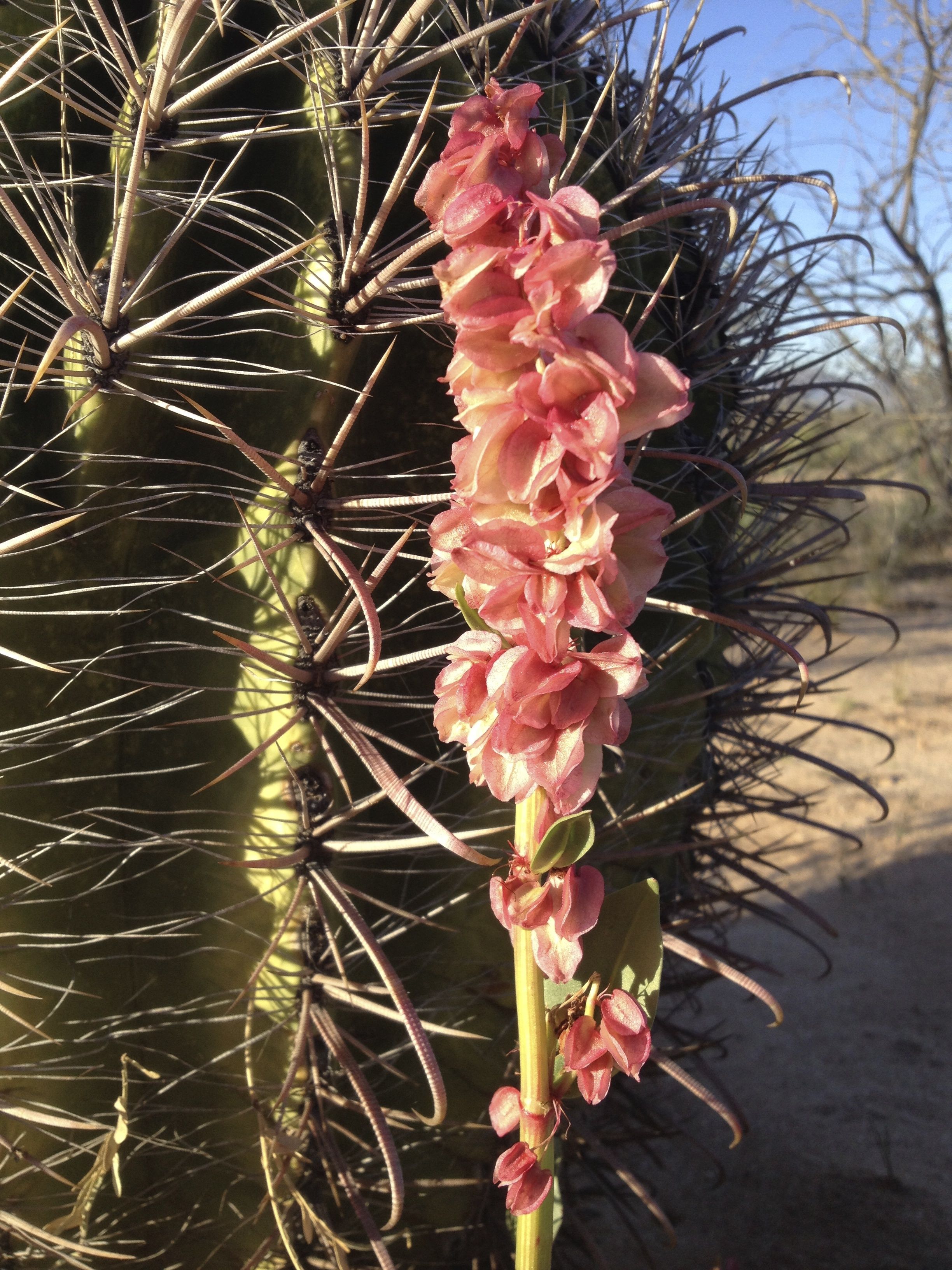 It’s an unusual winter season when Canaigre (also known by many other names:  Wild Rhubarb, Desert Dock,  Hiwidchuls in O’odham language, Latin name Rumex hymenosepalus) creeps up out of its sandy hiding places to bloom and seed before spring weather gets too warm.  When conditions are right, it can dot the desert floor in early spring with its floppy leathery leaves and pink stalks similar to domestic rhubarb.  This recent cool season Nov.2016-Jan.2017, with its period of penetrating rains, has been the right trigger for awakening canaigre.  Right now it’s time to attune our vision to finding it!  If the weather heats up rapidly, as happened in the last couple of springs, its tender leaf rosettes will dry and crinkle leaving a brown organic “shadow” of itself on the sand, its stored life safely underground in fat roots.  Tia Marta here to share some experiences with canaigre or wild rhubarb.