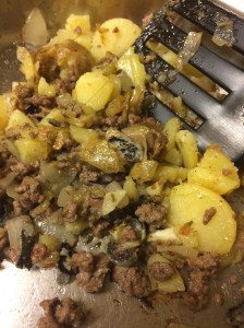Cuitlacoche Casserole made with ground bison burger, onion, potatoes, mild green chiles, and diced teosinte corn smut (MABurgess photo)