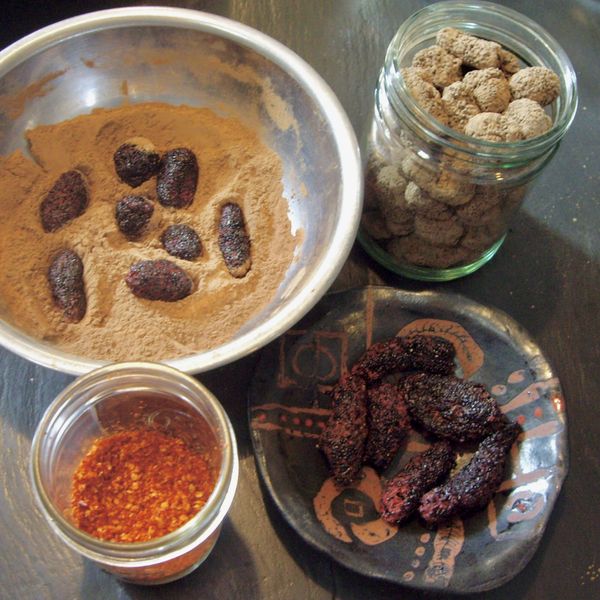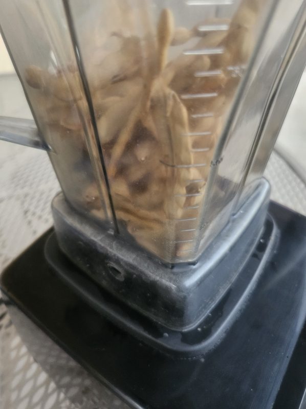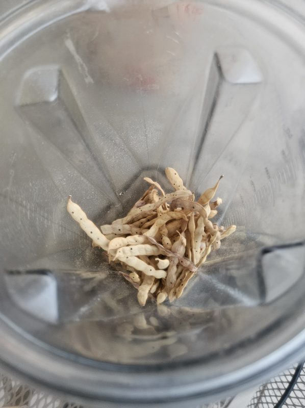 After cooling JUST enough to handle easily, I tossed the pods into a high powered blender. A regular blender or food process does not suffice. Without the last minute toasting, grinding makes a paste in there. This of course is an issue with any mesquite meal grinding method, but expecially for the blender or stone tools.