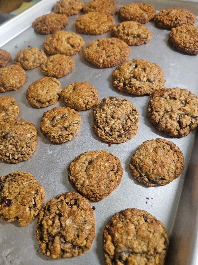 I baked these chocolate chip oatmeal mesquite pecan cookies until just barely set, let them finish cooling in transit, and served them chewy with the chocolate still melted. I’m sure they would not tolerate stacking. Some were full sized, the others bit sized. None were leftover.