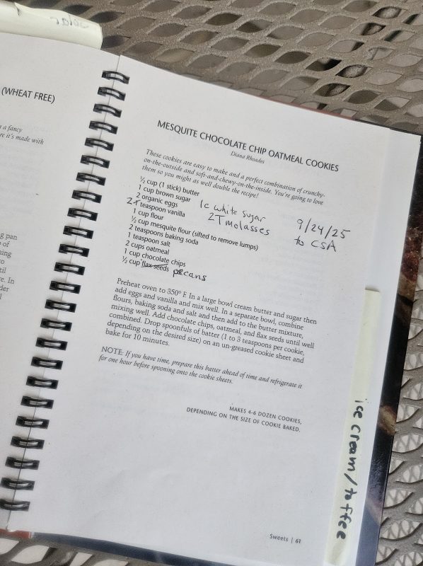 Chocolate chip cookies! I had a half bag of chocolate chips and pecans on hand, and chocolate with mesquite is classic. In case my butter spent too much time in the freezer, I doubled the vanilla. No brown sugar in sight, but a gallon of mollassas to use up.
