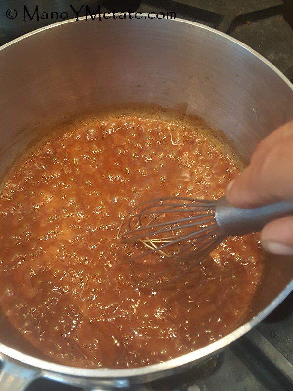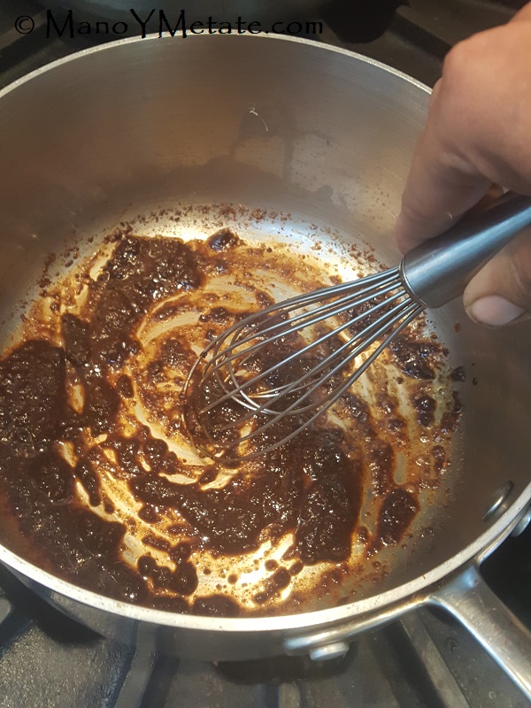 Bring about two cups of water to a boil in a small saucepan and add the piloncillo. Turn off the heat and let the sugar dissolve. If you can’t find piloncillo, use 8 ounces of dark brown or turbinado sugar.