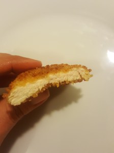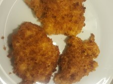 I cut the breast in a few pieces. This time, I forgot to dredge in flour first, which makes a thicker coating. Then dip the meat in a beaten egg.