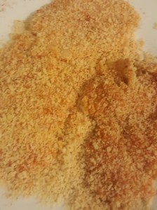 The seasoned crumbs stick to the egg coated chicken, but I pressed extra on to the meat.