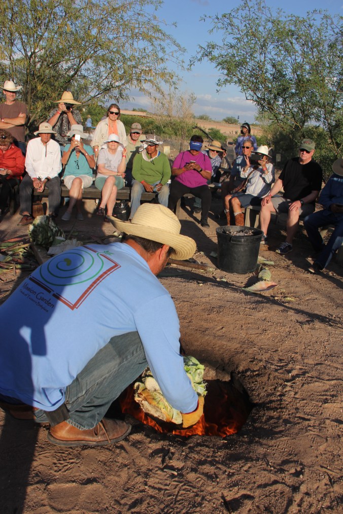 A volunteer at Tucson’s Mission Garden at a fall harvest. Two of the “Three Sisters” (Chapalote corn and Magdalena Big Cheese Squash) were dry and ready to harvest.(MABurgess photo)