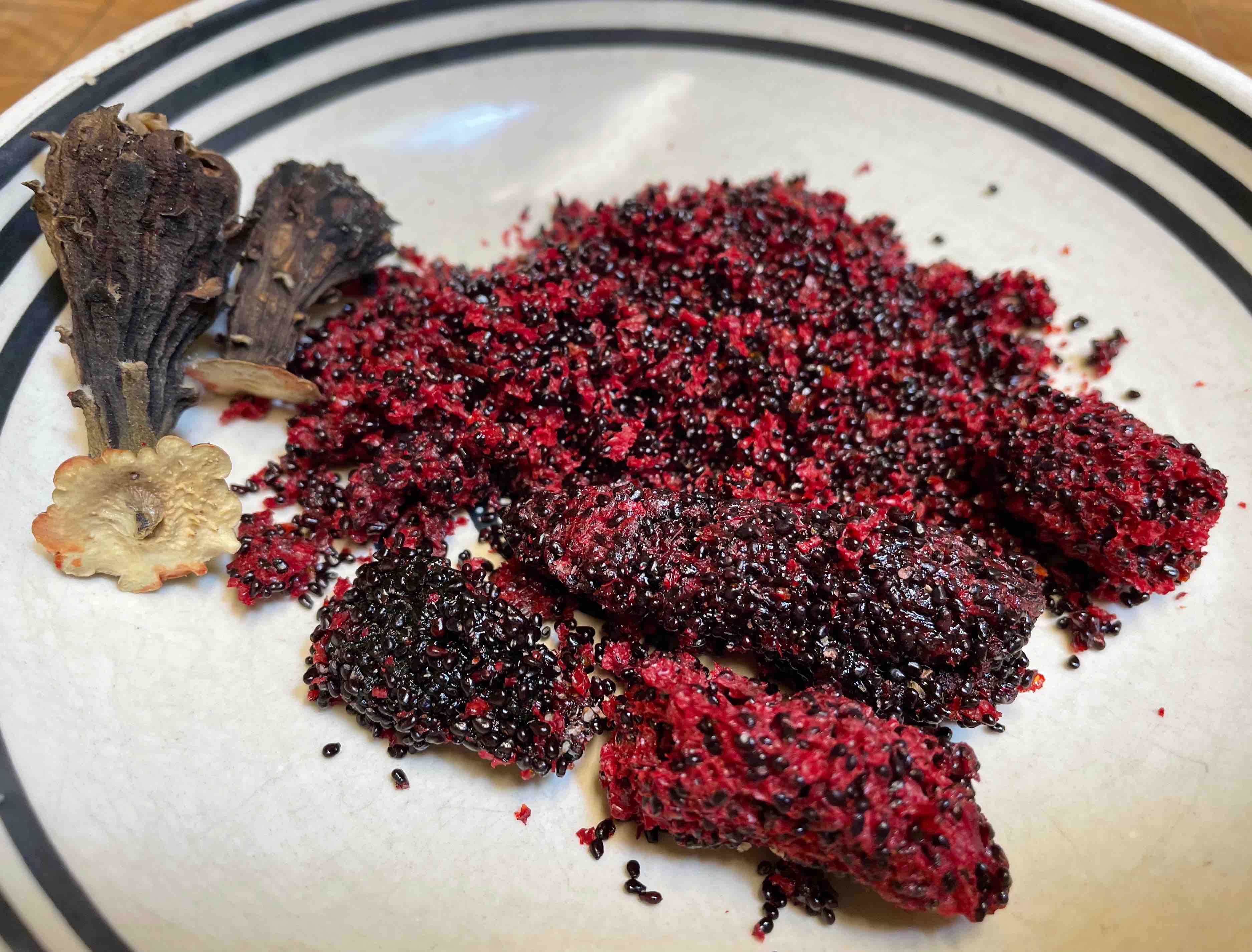 At Solstice saguaro harvest time, I used the dried flower calyx to open fruits and dry them for later. NOW I get to enjoy them again in a Seed Cake…