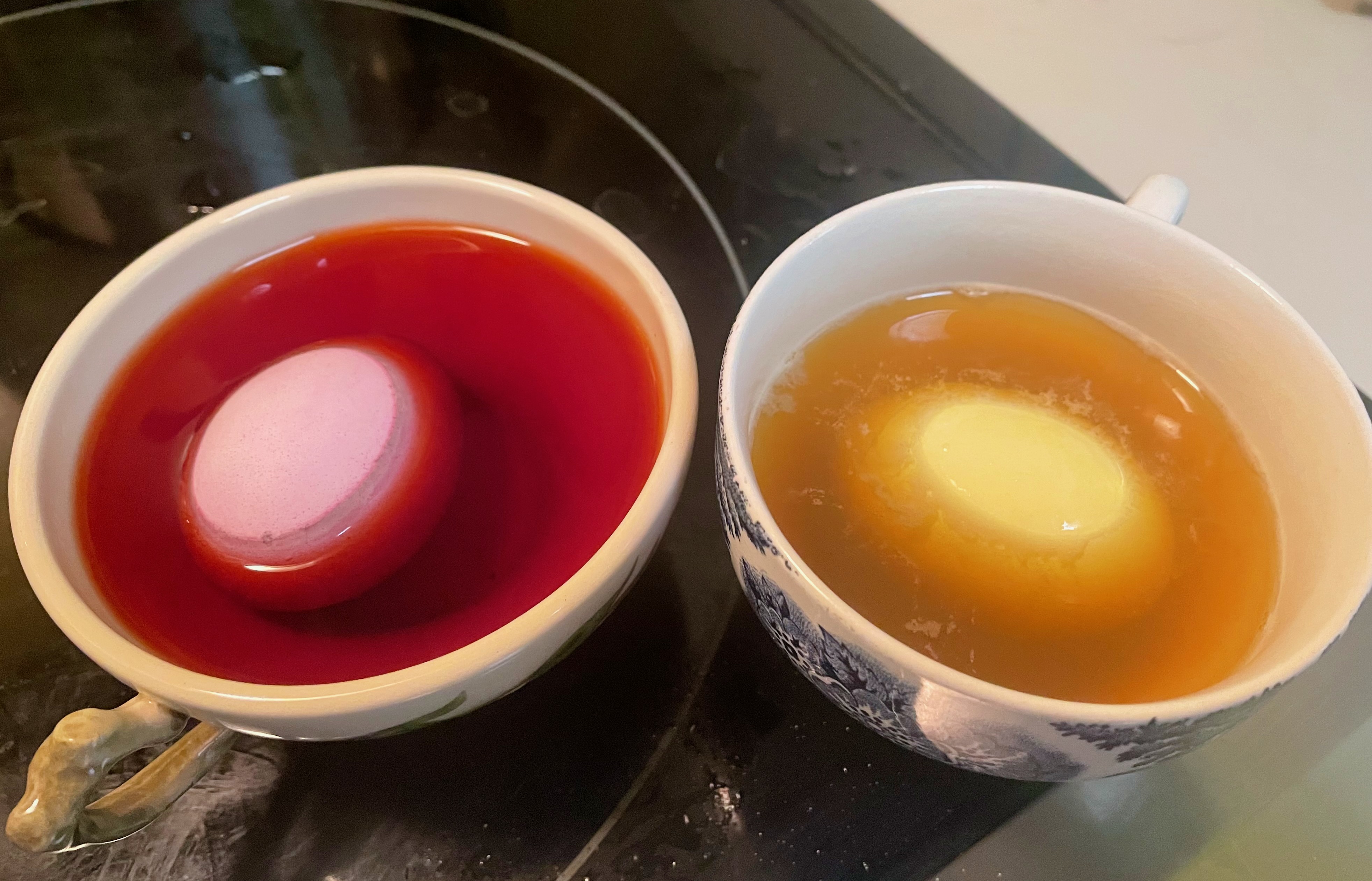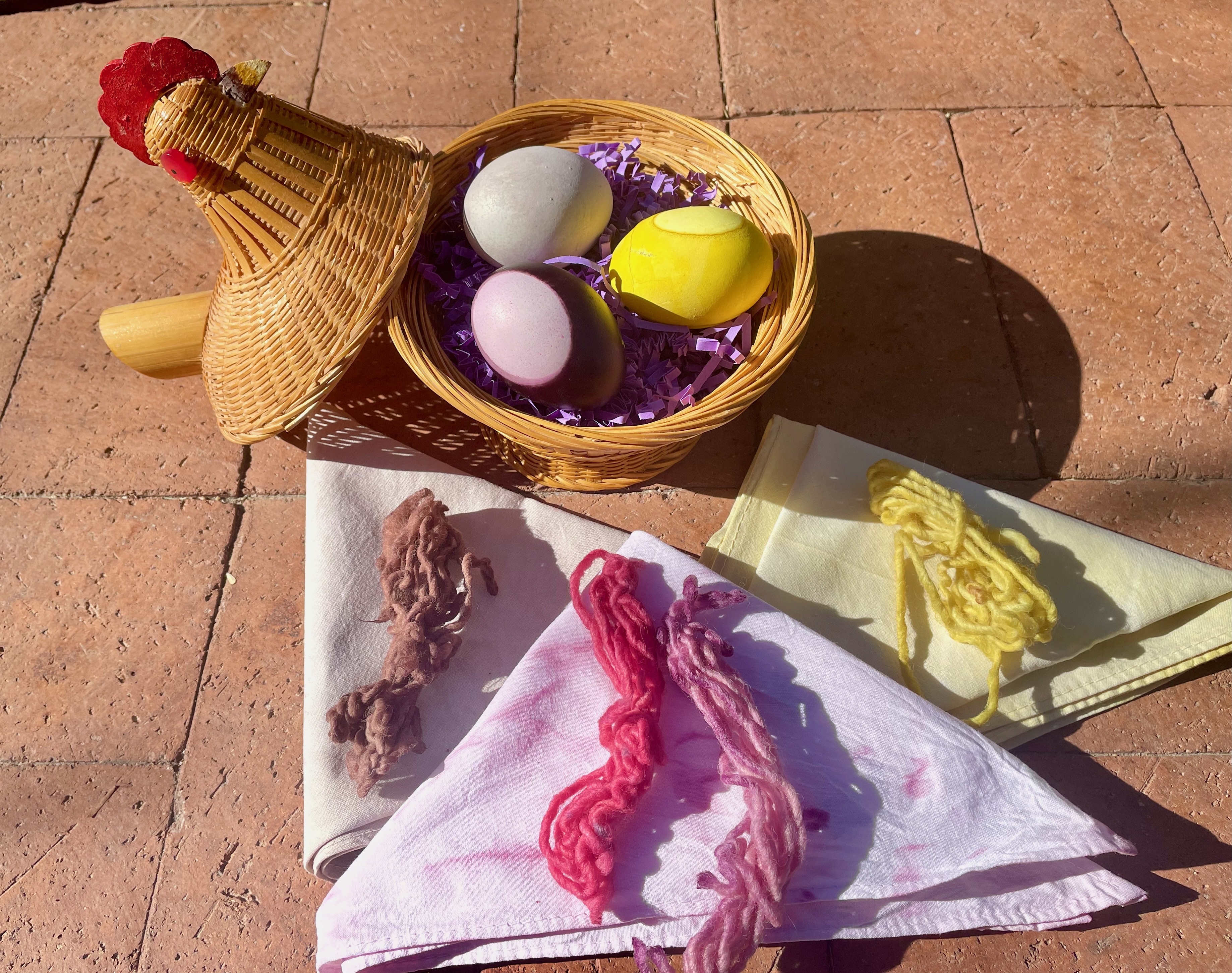 For a Tohono O’odham Community College art class we had experimented dyeing yarn and cotton with blackbean juice (left, gray/taupe), cochineal insect (center, pink/lavender), and brittlebush (right, yellow). Later (seen in my chicken basket above for the season) I further experimented with a new medium, eggs! My plant dyes, used cold, actually worked–a warm gray from blackbeans, bright yellow from brittlebush flowers, and deeeeep purple from cochineal! Here’s my close-up process: I placed boiled white eggs (from Mission Garden’s heirloom chickens) into cochineal dye (left) and brittlebush flower dye (right) to bathe for an hour and–voila!–we had Easter eggs. The dye didn’t even penetrate the shells. Who knows–My next step may be to make fancy deviled eggs with pickled cholla buds….