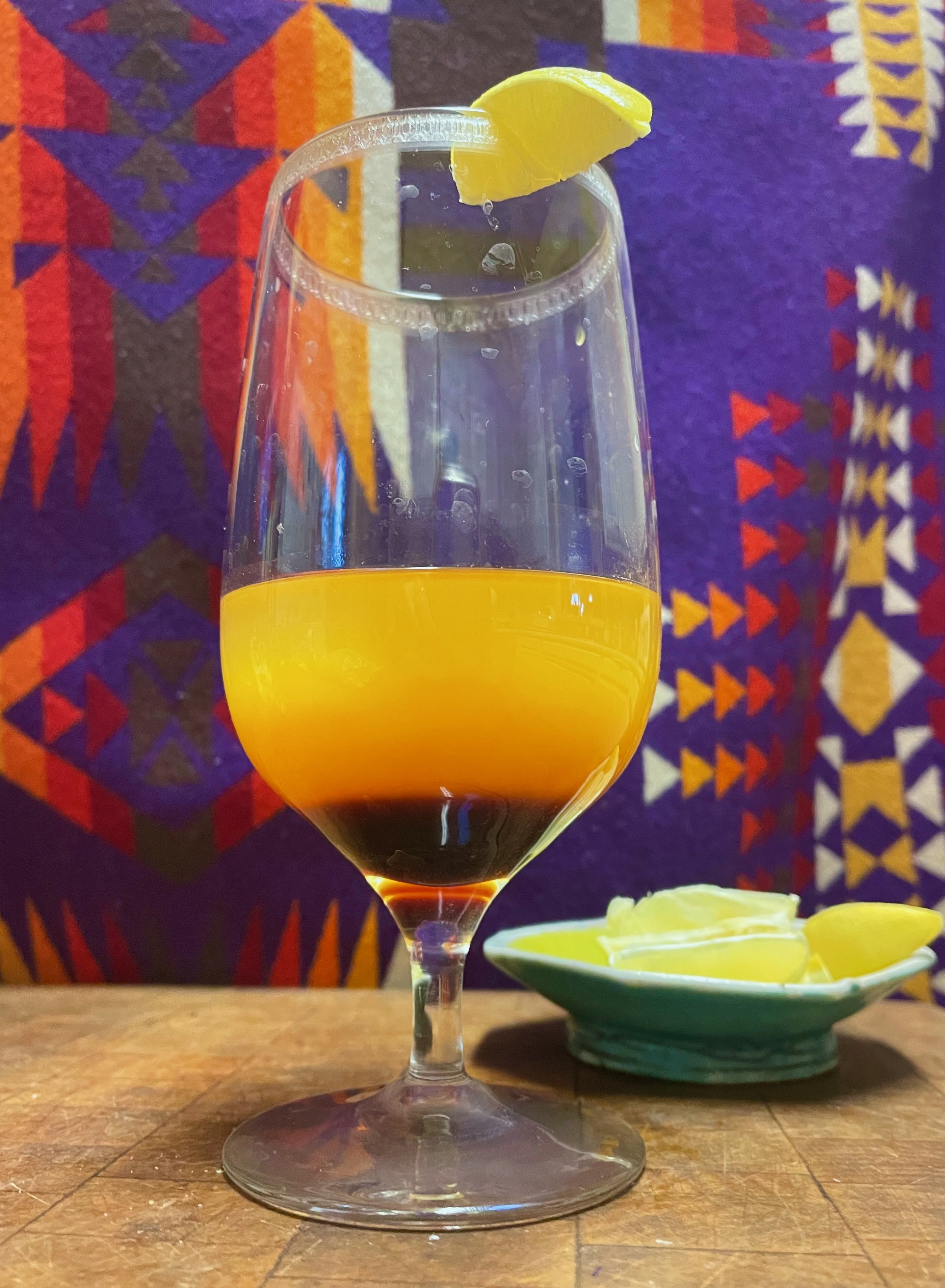 5–(a secret from my formerly-bartender partner): Gently pour the diluted mango juice atop the saguaro syrup layer by placing a spoon upside down to slow the flow against the glass interior, thus preserving the horizonal layers of different densities.