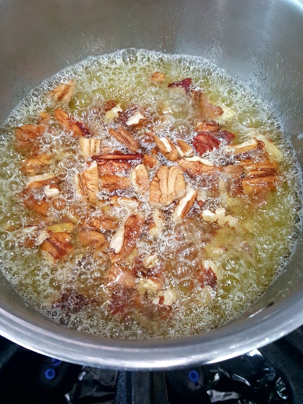 I browned 5 tablespoons unsalted butter! (Remember, this is making it like ice CREAM instead of ice MILK.) Then I added over half a cup of broken pecans to toast in the butter. Yes, it smelled as good as it looks.