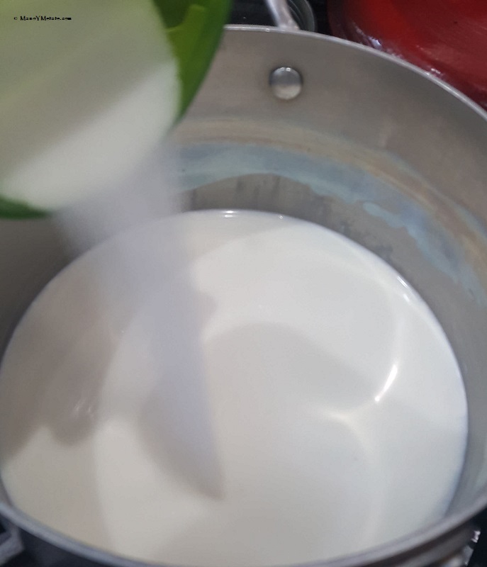 I didn’t want to buy cream and I didn’t want rock hard ice milk. Wondering if I could add enough butter to make it work, I found this recipe and adapted it to make butter pecan. I started with just over 2 cups milk, a scant 3/4 cup sugar, 1/2 teaspoon vanilla powder (ground vanilla pods) and 1/8 teaspoon salt over low heat.