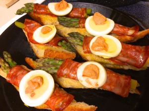 Wrap asparagus spears in chorizo.  If you have Mexican-style chorizo, fry the chorizo-wrapped spears until chorizo is barely done then place on bread to bake in oven or solar oven.  If sliced Spanish-style chorizo is used, bake entire bread/asparagus/chorizo stack in oven or solar oven.  Bake pintxos until asparagus is al-dente (not too long, 300degrees 12-15minutes, or roughly 20-25minutes in a preheated solar oven).  Top with sliced boiled egg and Chile-yogurt sauce.