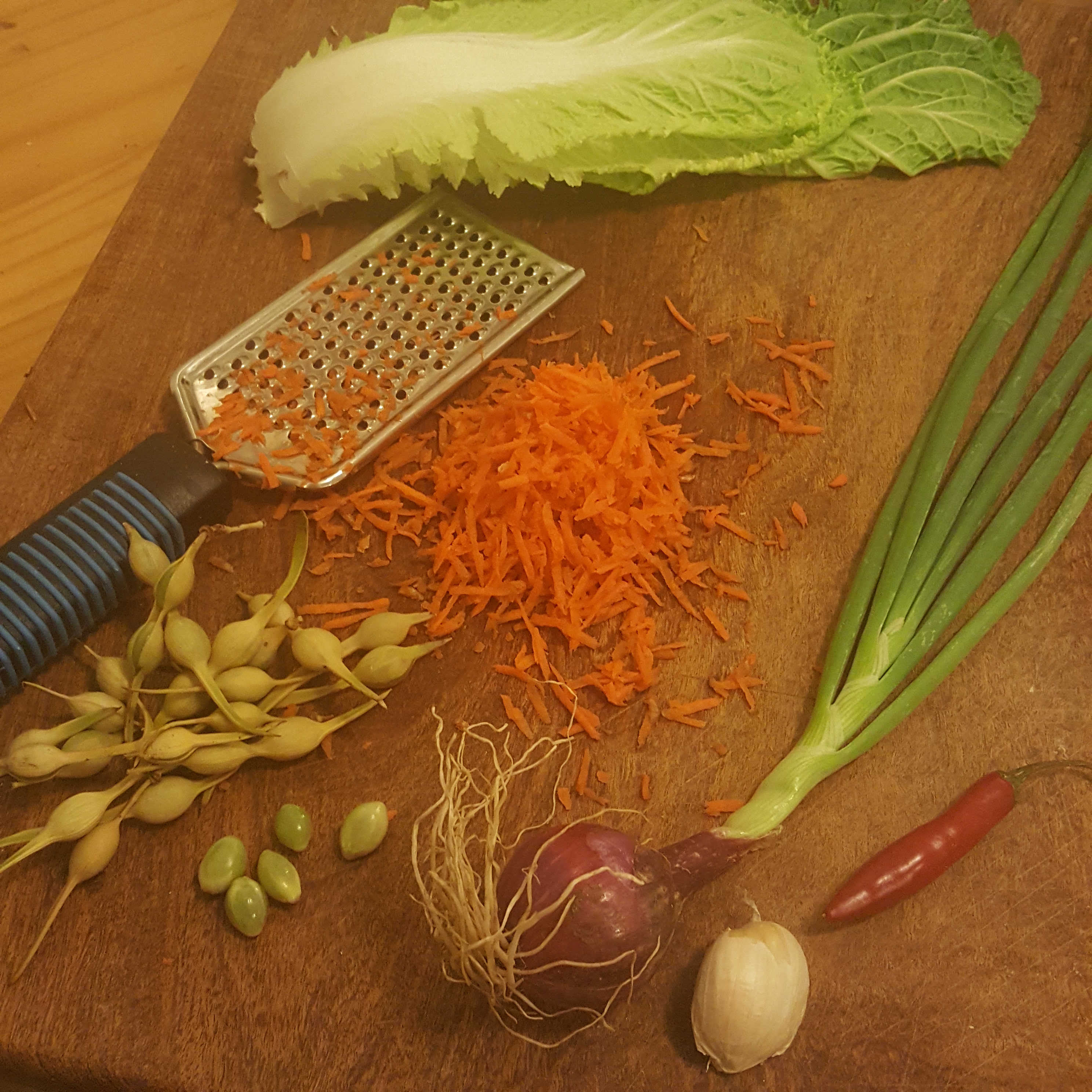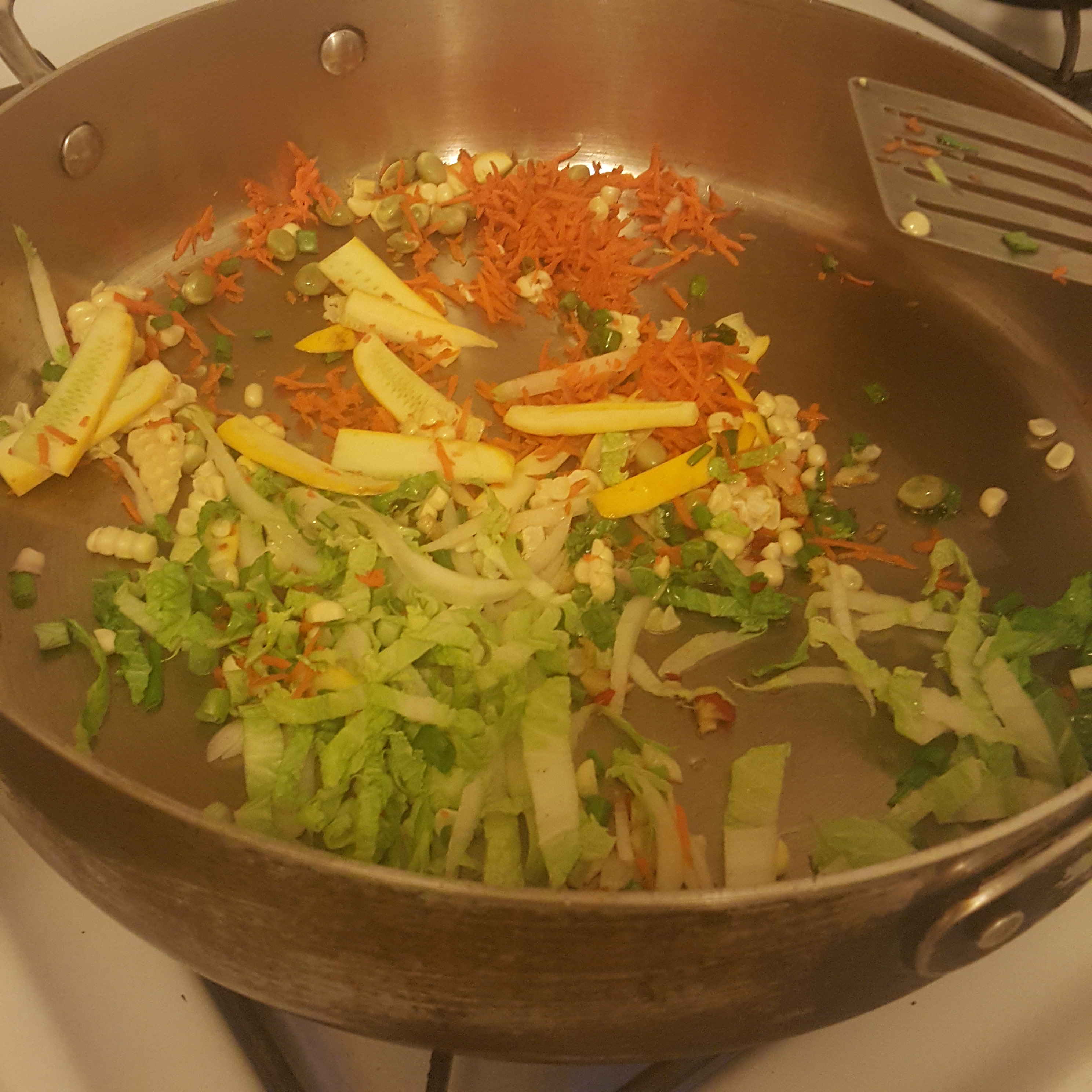 Cut all the veggies. This is not the dish to start cooking the longer cooking items before you cut the others. The original recipe called for spring onion and a little fresh ginger. I used carrot, cabbage, golden zucchini, young onion tops and bottoms, sweet corn and tender blanched palo verde seeds. For spice, I used garlic, ripe serrano and lots of ginger.