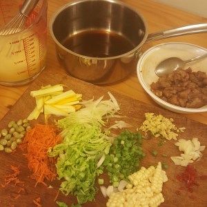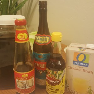 In a small saucepan, measure all the sauce ingredients and set aside: chicken or mushroom broth, oyster sauce (or mushroom sauce), rice wine, sesame oil and cornstarch.