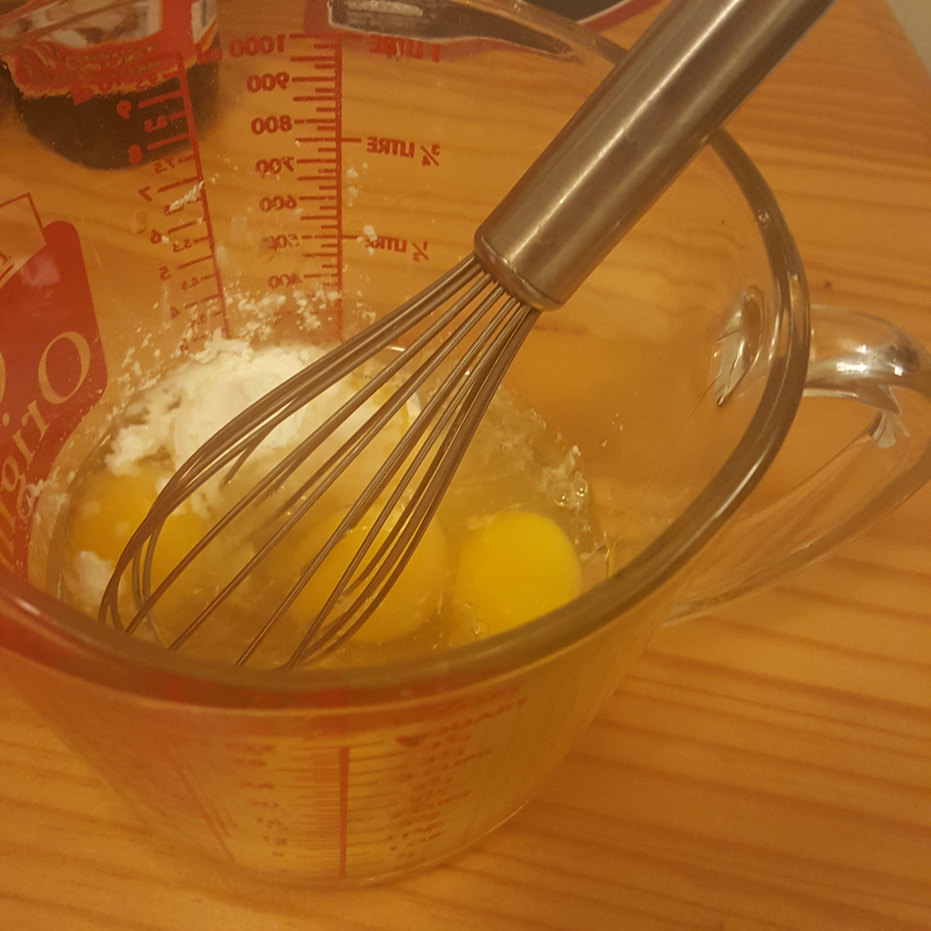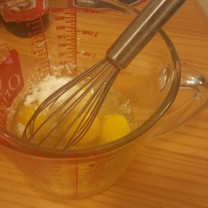 Then beat eggs, cornstarch and a splash of water. Next time I’ll mix the cornstarch and water before the eggs to prevent difficult to remove lumps.